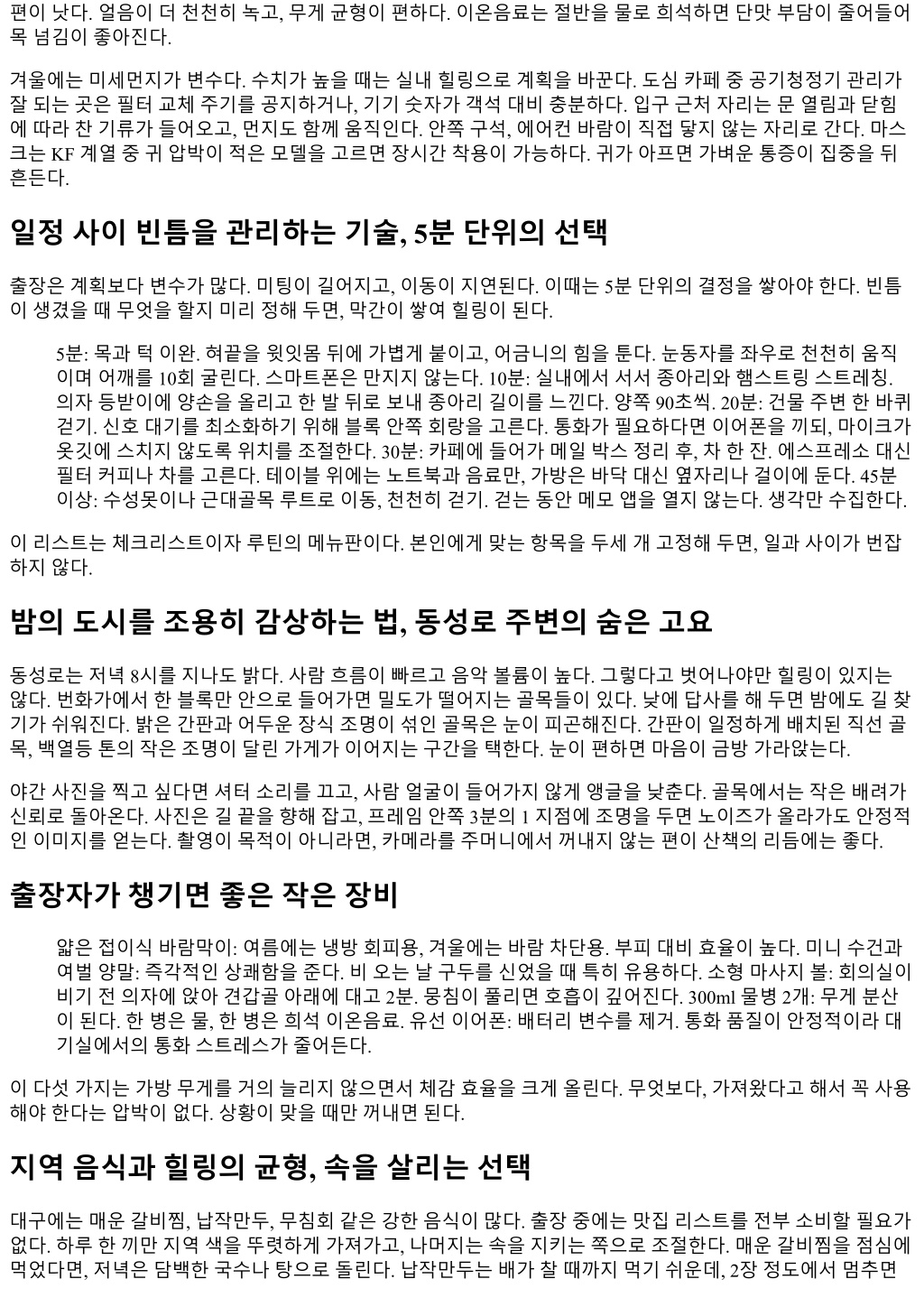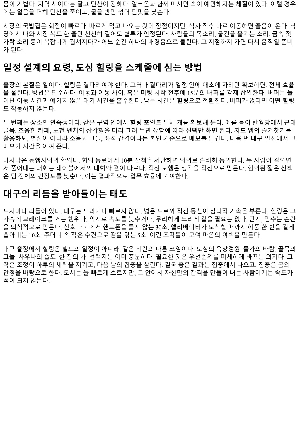 몸이가볍다. 지역사이다는달고탄산이강하다. 알코올과함께마시면속이예민해지는체질이있다. 이럴경우 에는얼음을더해탄산을죽이고, 물을반만섞어단맛을낮춘다. 시장의국밥집은회전이빠르다. 빠르게먹고나오는것이장점이지만, 식사직후바로이동하면졸음이온다. 식 당에서나와시장복도한줄만천천히걸어도혈류가안정된다. 사람들의목소리, 물건을옮기는소리, 금속젓 가락소리등이복잡하게겹쳐지다가어느순간하나의배경음으로들린다. 그지점까지가면다시움직일준비 가된다. 일정설계의요령, 도심힐링을스케줄에심는방법 출장의본질은일이다. 힐링은곁다리여야한다. 그러나곁다리가일정안에애초에자리만확보하면, 전체효율 을올린다. 방법은단순하다. 이동과이동사이, 혹은미팅시작전후에 15분의버퍼를강제삽입한다. 버퍼는늘 어난이동시간과예기치않은대기시간을흡수한다. 남는시간은힐링으로전환한다. 버퍼가없다면어떤힐링 도작동하지않는다. 두번째는장소의연속성이다. 같은구역안에서힐링포인트두세개를확보해둔다. 예를들어반월당에서근대 골목, 조용한카페, 노천벤치의삼각형을미리그려두면상황에따라선택만하면된다. 지도앱의즐겨찾기를 활용하되, 별점이아니라소음과그늘, 좌석간격이라는본인기준으로메모를남긴다. 다음번대구일정에서그 메모가시간을아껴준다. 마지막은동행자와의합의다. 회의동료에게 10분산책을제안하면의외로흔쾌히동의한다. 두사람이걸으면 서풀어내는대화는테이블에서의대화와결이다르다. 직선보행은생각을직선으로만든다. 합의된짧은산책 은팀전체의긴장도를낮춘다. 이는결과적으로업무효율에기여한다. 대구의리듬을받아들이는태도 도시마다리듬이있다. 대구는느리거나빠르지않다. 넓은도로와직선동선이심리적가속을부른다. 힐링은그 가속에브레이크를거는행위다. 억지로속도를늦추거나, 무리하게느리게걸을필요는없다. 단지, 멈추는순간 을의식적으로만든다. 신호대기에서핸드폰을들지않는 30초, 엘리베이터가도착할때까지하품한번을길게 뽑아내는 10초, 주머니속작은수건으로땀을닦는 5초. 이런조각들이모여마음의여백을만든다. 대구출장에서힐링은별도의일정이아니라, 같은시간의다른쓰임이다. 도심의옥상정원, 물가의바람, 골목의 그늘, 사우나의습도, 한잔의차. 선택지는이미충분하다. 필요한것은우선순위를미세하게바꾸는의지다. 그 작은조정이하루의체력을지키고, 다음날의집중을살린다. 결국좋은결과는집중에서나오고, 집중은몸의 안정을바탕으로한다. 도시는늘빠르게흐르지만, 그안에서자신만의간격을만들어내는사람에게는속도가 적이되지않는다.