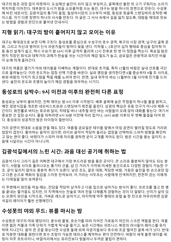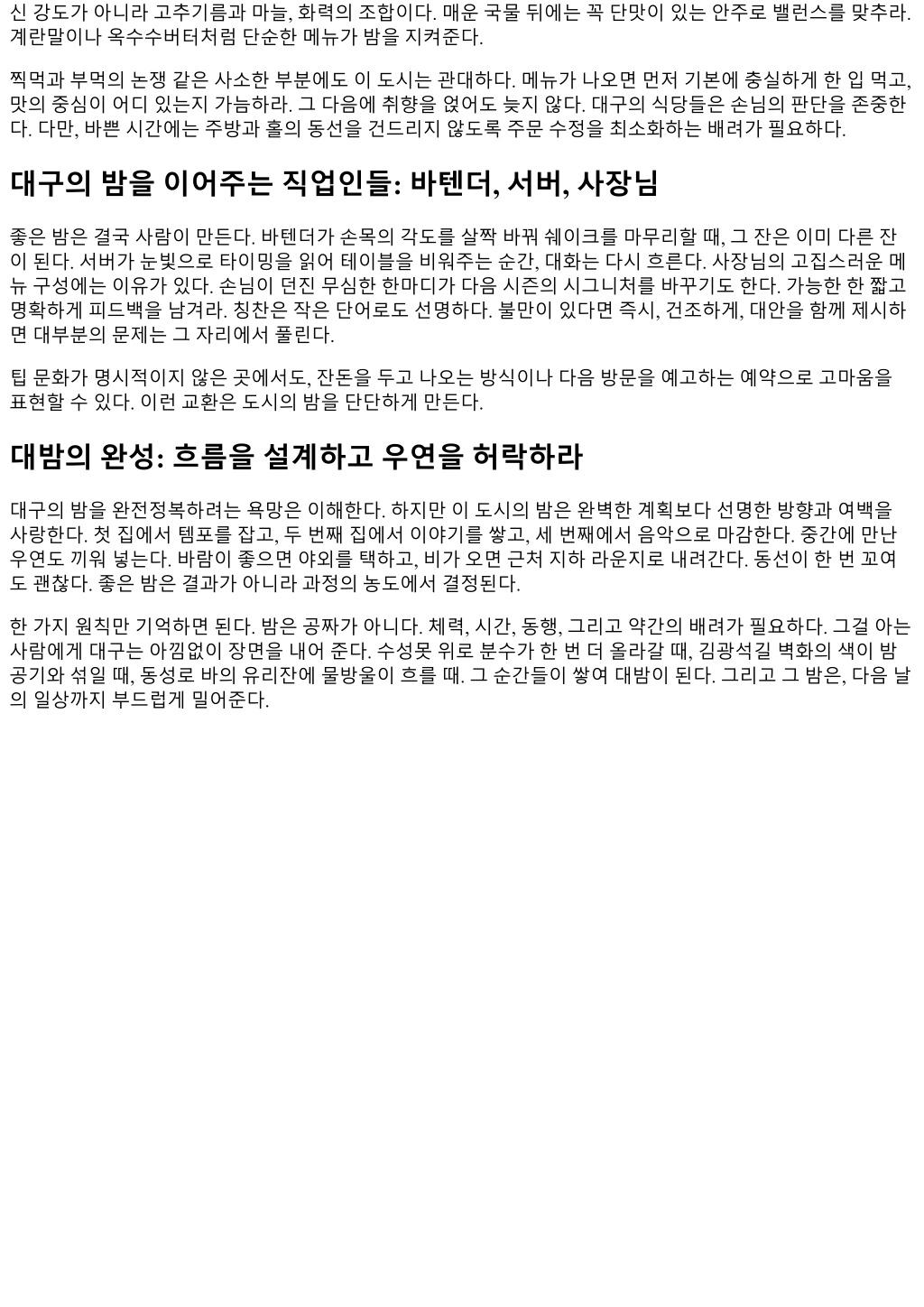 신강도가아니라고추기름과마늘, 화력의조합이다. 매운국물뒤에는꼭단맛이있는안주로밸런스를맞추라. 계란말이나옥수수버터처럼단순한메뉴가밤을지켜준다. 찍먹과부먹의논쟁같은사소한부분에도이도시는관대하다. 메뉴가나오면먼저기본에충실하게한입먹고, 맛의중심이어디있는지가늠하라. 그다음에취향을얹어도늦지않다. 대구의식당들은손님의판단을존중한 다. 다만, 바쁜시간에는주방과홀의동선을건드리지않도록주문수정을최소화하는배려가필요하다. 대구의밤을이어주는직업인들: 바텐더, 서버, 사장님 좋은밤은결국사람이만든다. 바텐더가손목의각도를살짝바꿔쉐이크를마무리할때, 그잔은이미다른잔 이된다. 서버가눈빛으로타이밍을읽어테이블을비워주는순간, 대화는다시흐른다. 사장님의고집스러운메 뉴구성에는이유가있다. 손님이던진무심한한마디가다음시즌의시그니처를바꾸기도한다. 가능한한짧고 명확하게피드백을남겨라. 칭찬은작은단어로도선명하다. 불만이있다면즉시, 건조하게, 대안을함께제시하 면대부분의문제는그자리에서풀린다. 팁문화가명시적이지않은곳에서도, 잔돈을두고나오는방식이나다음방문을예고하는예약으로고마움을 표현할수있다. 이런교환은도시의밤을단단하게만든다. 대밤의완성: 흐름을설계하고우연을허락하라 대구의밤을완전정복하려는욕망은이해한다. 하지만이도시의밤은완벽한계획보다선명한방향과여백을 사랑한다. 첫집에서템포를잡고, 두번째집에서이야기를쌓고, 세번째에서음악으로마감한다. 중간에만난 우연도끼워넣는다. 바람이좋으면야외를택하고, 비가오면근처지하라운지로내려간다. 동선이한번꼬여 도괜찮다. 좋은밤은결과가아니라과정의농도에서결정된다. 한가지원칙만기억하면된다. 밤은공짜가아니다. 체력, 시간, 동행, 그리고약간의배려가필요하다. 그걸아는 사람에게대구는아낌없이장면을내어준다. 수성못위로분수가한번더올라갈때, 김광석길벽화의색이밤 공기와섞일때, 동성로바의유리잔에물방울이흐를때. 그순간들이쌓여대밤이된다. 그리고그밤은, 다음날 의일상까지부드럽게밀어준다.