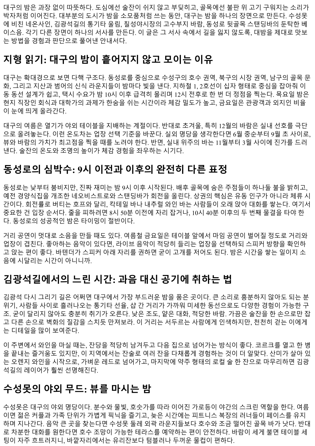 대구의밤은과장없이따뜻하다. 도심에선술잔이쉬지않고부딪히고, 골목에선불판위고기구워지는소리가 박자처럼이어진다. 대부분의도시가밤을소모품처럼쓰는동안, 대구는밤을하나의장면으로만든다. 수성못 에비친네온사인, 김광석길의통기타울림, 칠성야시장의고수부지바람, 동성로뒷골목스탠딩바의둔탁한베 이스음. 각기다른장면이하나의서사를만든다. 이글은그서사속에서길을잃지않도록, 대밤을제대로맛보 는방법을경험과판단으로풀어낸안내서다. 지형읽기: 대구의밤이흩어지지않고모이는이유 대구는확대경으로보면다핵구조다. 동성로를중심으로수성구의호수권역, 북구의시장권역, 남구의골목문 화, 그리고지산과범어의신식라운지들이밤마다빛을낸다. 지하철 1, 2호선이십자형태로중심을잡아줘이 동동선설계가쉽고, 택시수요가밤 10시이후급격히몰리며 12시전후로한번더정점을찍는다. 목요일밤은 현지직장인회식과대학가의과제가한숨을쉬는시간이라체감밀도가높고, 금요일은관광객과외지인비율 이눈에띄게올라간다. 대구의여름은열기가야외테이블을지배하는계절이다. 반대로초겨울, 특히 12월의바람은실내선호를극단 으로올려놓는다. 이런온도차는업장선택기준을바꾼다. 실외명당을생각한다면 6월중순부터 9월초사이로, 뷰와바람의가치가최고점을찍을때를노려야한다. 반면, 실내위주의바는 11월부터 3월사이에진가를드러 낸다. 술잔의온도와조명의높이가체감경험을좌우하는시기다. 동성로의심박수: 9시이전과이후의완전히다른표정 동성로는낮부터붐비지만, 진짜재미는밤 9시이후시작된다. 배후골목에숨은주점들이하나둘불을밝히고, 예전경양식집을개조한네오비스트로와스탠딩바가회전을올린다. 상권의핵심은유동인구가아니라체류시 간이다. 회전률로버티는호프와달리, 칵테일바나내추럴와인바는사람들이오래앉아대화를쌓는다. 여기서 중요한건입장순서다. 줄을피하려면 8시 50분이전에자리잡거나, 10시 40분이후의두번째물결을타야한 다. 동성로의성공적인밤은타이밍이절반이다. 거리공연이멋대로소음을만들때도있다. 여름철금요일은테이블앞에서마임공연이벌어질정도로거리와 업장이겹친다. 좋아하는음악이있다면, 라이브음악이적당히들리는업장을선택하되스피커방향을확인하 고앉는편이좋다. 바텐더가스피커아래자리를권하면굳이고개를저어도된다. 밤은시간을쌓는일이지소 음에시달리는시간이아니니까. 김광석길에서의느린시간: 과음대신공기에취하는법 김광석다시그리기길은어쩌면대구에서가장부드러운밤을품은곳이다. 큰소리로흥분하지않아도되는분 위기, 사람들사이로흘러나오는통기타선율, 샵간거리가가까워미세한동선으로도다양한경험이가능한구 조. 굳이달리지않아도충분히취기가오른다. 낮은조도, 얕은대화, 적당한바람. 가끔은술잔을한손으로만잡 고다른손으로벽화의질감을스치듯만져보라. 이거리는서두르는사람에게인색하지만, 천천히걷는이에게 는디테일을많이보여준다. 이주변에서와인을마실때는, 잔당을적당히남겨두고다음집으로넘어가는방식이좋다. 코르크를열고한병 을끝내는즐거움도있지만, 이지역에서는잔술로여러잔을다채롭게경험하는것이더알맞다. 산미가살아있 는오렌지와인을시작으로, 가벼운레드로넘어가고, 마지막에약주형태의로컬술한잔으로마무리하면김광 석길의레이어가훨씬선명해진다. 수성못의야외무드: 뷰를마시는밤 수성못은대구의야외명당이다. 분수와물빛, 호숫가를따라이어진가로등이야간의스크린역할을한다. 여름 이면젊은커플과가족단위가가볍게픽닉을즐기고, 늦은시간에는피트니스복장의러너들이페이스를유지 하며지나간다. 음악큰곳을찾는다면수성못둘레외곽라운지들보다호수와조금떨어진골목바가낫다. 반대 로차분한대화를원한다면호수조망이가능한테라스를예약하는편이안전하다. 바람이세게불면테이블세 팅이자주흐트러지니, 바깥자리에서는유리잔보다텀블러나두꺼운물컵이편하다.