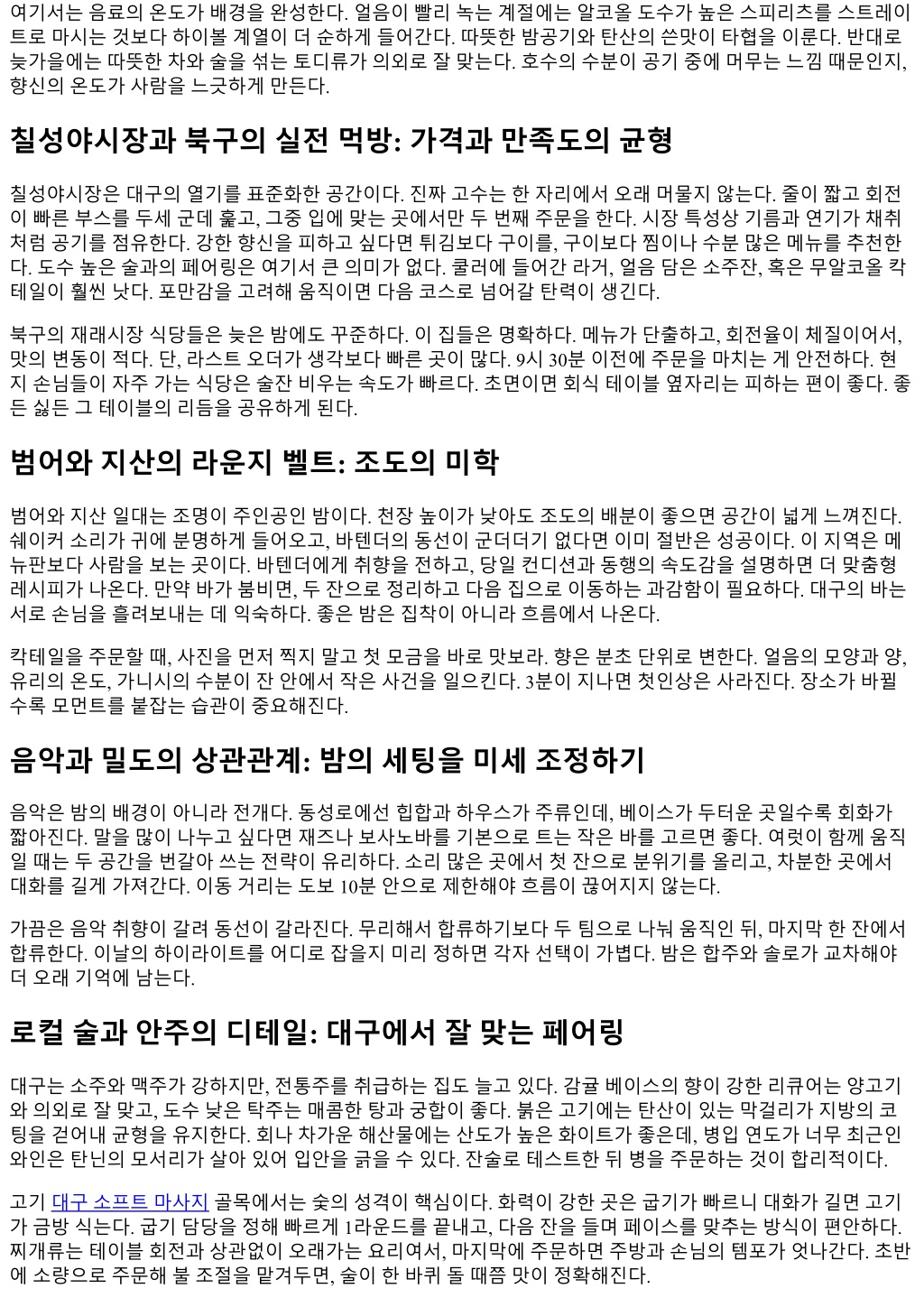 여기서는음료의온도가배경을완성한다. 얼음이빨리녹는계절에는알코올도수가높은스피리츠를스트레이 트로마시는것보다하이볼계열이더순하게들어간다. 따뜻한밤공기와탄산의쓴맛이타협을이룬다. 반대로 늦가을에는따뜻한차와술을섞는토디류가의외로잘맞는다. 호수의수분이공기중에머무는느낌때문인지, 향신의온도가사람을느긋하게만든다. 칠성야시장과북구의실전먹방: 가격과만족도의균형 칠성야시장은대구의열기를표준화한공간이다. 진짜고수는한자리에서오래머물지않는다. 줄이짧고회전 이빠른부스를두세군데훑고, 그중입에맞는곳에서만두번째주문을한다. 시장특성상기름과연기가채취 처럼공기를점유한다. 강한향신을피하고싶다면튀김보다구이를, 구이보다찜이나수분많은메뉴를추천한 다. 도수높은술과의페어링은여기서큰의미가없다. 쿨러에들어간라거, 얼음담은소주잔, 혹은무알코올칵 테일이훨씬낫다. 포만감을고려해움직이면다음코스로넘어갈탄력이생긴다. 북구의재래시장식당들은늦은밤에도꾸준하다. 이집들은명확하다. 메뉴가단출하고, 회전율이체질이어서, 맛의변동이적다. 단, 라스트오더가생각보다빠른곳이많다. 9시 30분이전에주문을마치는게안전하다. 현 지손님들이자주가는식당은술잔비우는속도가빠르다. 초면이면회식테이블옆자리는피하는편이좋다. 좋 든싫든그테이블의리듬을공유하게된다. 범어와지산의라운지벨트: 조도의미학 범어와지산일대는조명이주인공인밤이다. 천장높이가낮아도조도의배분이좋으면공간이넓게느껴진다. 쉐이커소리가귀에분명하게들어오고, 바텐더의동선이군더더기없다면이미절반은성공이다. 이지역은메 뉴판보다사람을보는곳이다. 바텐더에게취향을전하고, 당일컨디션과동행의속도감을설명하면더맞춤형 레시피가나온다. 만약바가붐비면, 두잔으로정리하고다음집으로이동하는과감함이필요하다. 대구의바는 서로손님을흘려보내는데익숙하다. 좋은밤은집착이아니라흐름에서나온다. 칵테일을주문할때, 사진을먼저찍지말고첫모금을바로맛보라. 향은분초단위로변한다. 얼음의모양과양, 유리의온도, 가니시의수분이잔안에서작은사건을일으킨다. 3분이지나면첫인상은사라진다. 장소가바뀔 수록모먼트를붙잡는습관이중요해진다. 음악과밀도의상관관계: 밤의세팅을미세조정하기 음악은밤의배경이아니라전개다. 동성로에선힙합과하우스가주류인데, 베이스가두터운곳일수록회화가 짧아진다. 말을많이나누고싶다면재즈나보사노바를기본으로트는작은바를고르면좋다. 여럿이함께움직 일때는두공간을번갈아쓰는전략이유리하다. 소리많은곳에서첫잔으로분위기를올리고, 차분한곳에서 대화를길게가져간다. 이동거리는도보 10분안으로제한해야흐름이끊어지지않는다. 가끔은음악취향이갈려동선이갈라진다. 무리해서합류하기보다두팀으로나눠움직인뒤, 마지막한잔에서 합류한다. 이날의하이라이트를어디로잡을지미리정하면각자선택이가볍다. 밤은합주와솔로가교차해야 더오래기억에남는다. 로컬술과안주의디테일: 대구에서잘맞는페어링 대구는소주와맥주가강하지만, 전통주를취급하는집도늘고있다. 감귤베이스의향이강한리큐어는양고기 와의외로잘맞고, 도수낮은탁주는매콤한탕과궁합이좋다. 붉은고기에는탄산이있는막걸리가지방의코 팅을걷어내균형을유지한다. 회나차가운해산물에는산도가높은화이트가좋은데, 병입연도가너무최근인 와인은탄닌의모서리가살아있어입안을긁을수있다. 잔술로테스트한뒤병을주문하는것이합리적이다. 고기대구소프트마사지골목에서는숯의성격이핵심이다. 화력이강한곳은굽기가빠르니대화가길면고기 가금방식는다. 굽기담당을정해빠르게 1라운드를끝내고, 다음잔을들며페이스를맞추는방식이편안하다. 찌개류는테이블회전과상관없이오래가는요리여서, 마지막에주문하면주방과손님의템포가엇나간다. 초반 에소량으로주문해불조절을맡겨두면, 술이한바퀴돌때쯤맛이정확해진다.