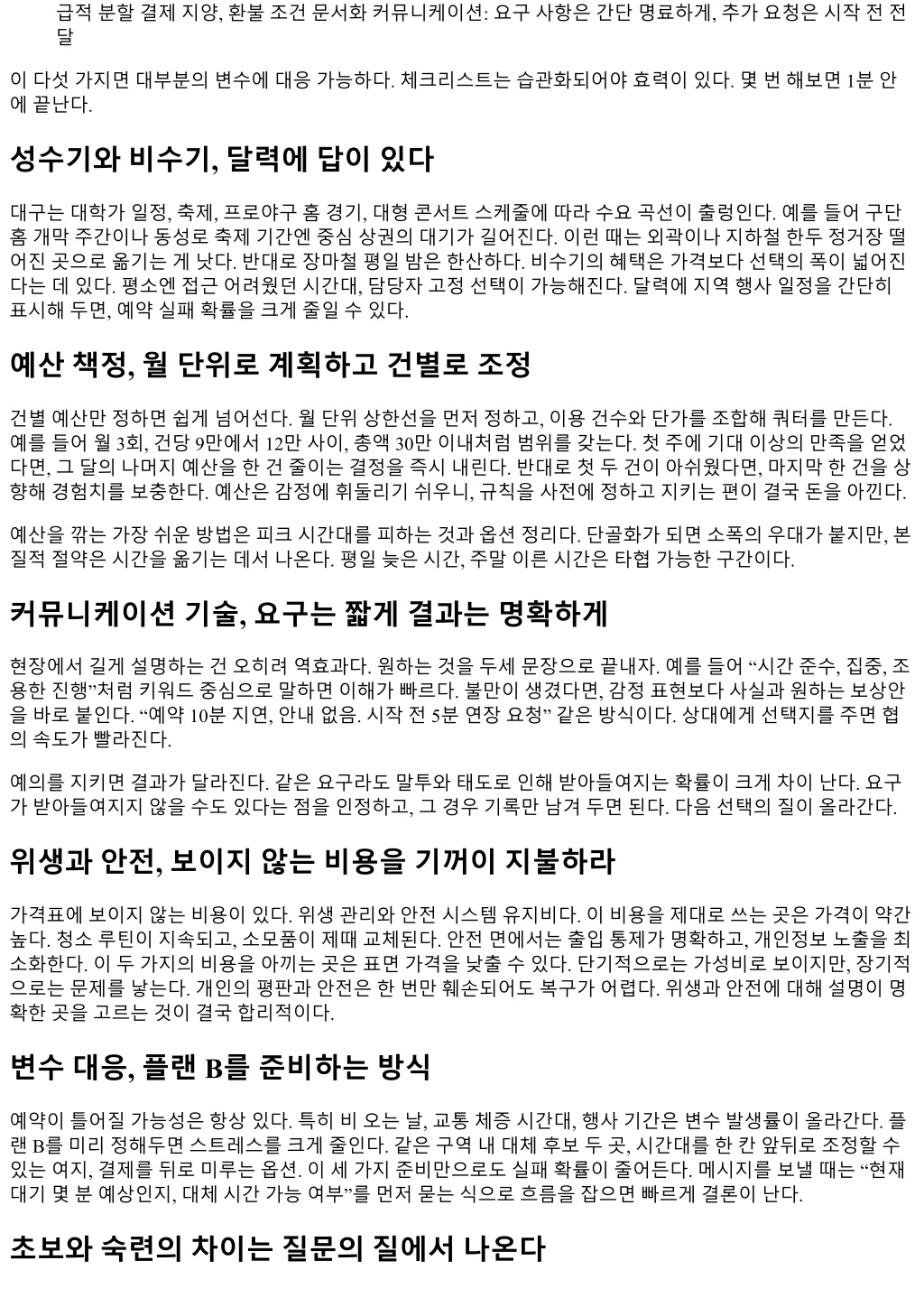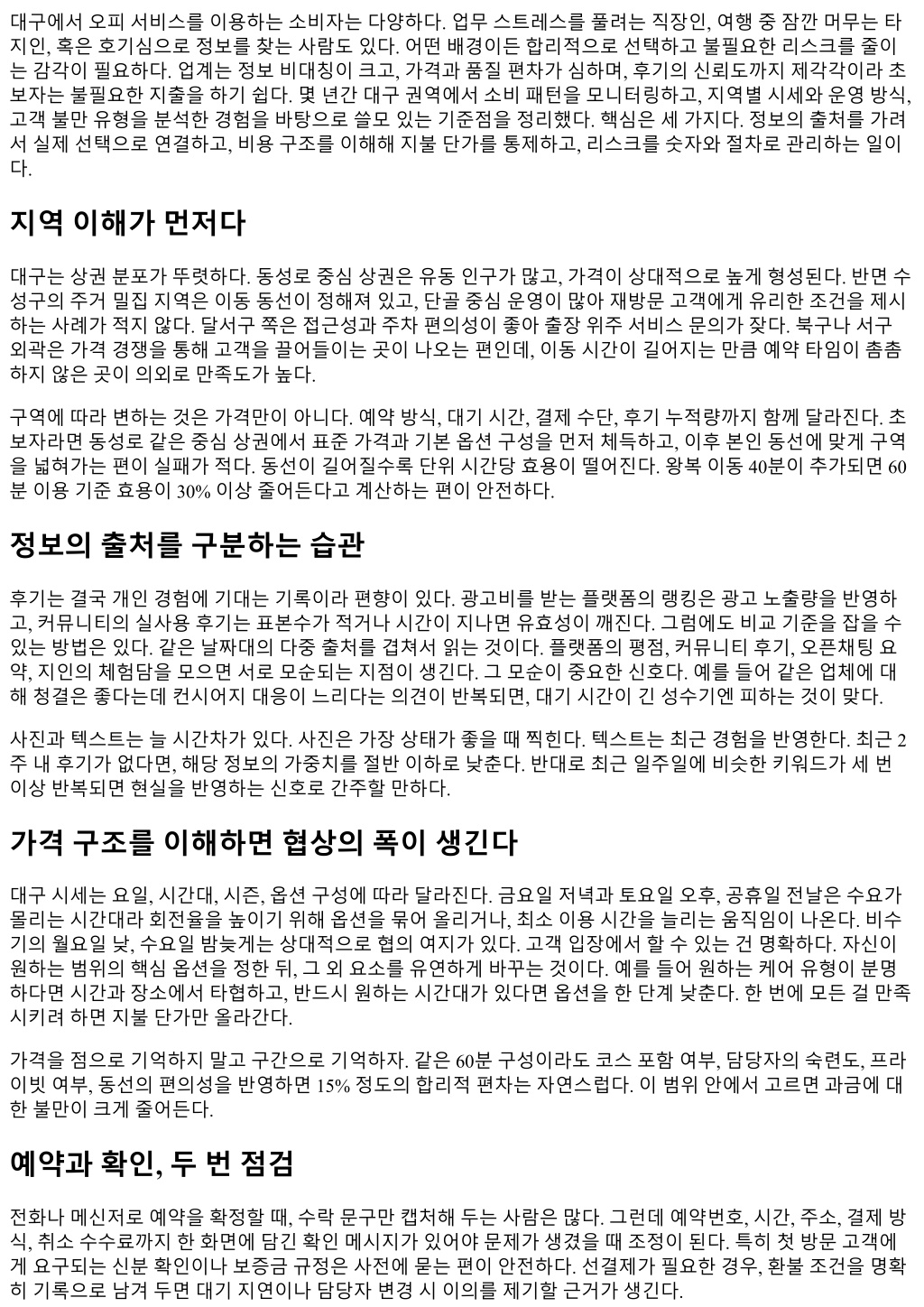 급적분할결제지양, 환불조건문서화커뮤니케이션: 요구사항은간단명료하게, 추가요청은시작전전 달 이다섯가지면대부분의변수에대응가능하다. 체크리스트는습관화되어야효력이있다. 몇번해보면 1분안 에끝난다. 성수기와비수기, 달력에답이있다 대구는대학가일정, 축제, 프로야구홈경기, 대형콘서트스케줄에따라수요곡선이출렁인다. 예를들어구단 홈개막주간이나동성로축제기간엔중심상권의대기가길어진다. 이런때는외곽이나지하철한두정거장떨 어진곳으로옮기는게낫다. 반대로장마철평일밤은한산하다. 비수기의혜택은가격보다선택의폭이넓어진 다는데있다. 평소엔접근어려웠던시간대, 담당자고정선택이가능해진다. 달력에지역행사일정을간단히 표시해두면, 예약실패확률을크게줄일수있다. 예산책정, 월단위로계획하고건별로조정 건별예산만정하면쉽게넘어선다. 월단위상한선을먼저정하고, 이용건수와단가를조합해쿼터를만든다. 예를들어월 3회, 건당 9만에서 12만사이, 총액 30만이내처럼범위를갖는다. 첫주에기대이상의만족을얻었 다면, 그달의나머지예산을한건줄이는결정을즉시내린다. 반대로첫두건이아쉬웠다면, 마지막한건을상 향해경험치를보충한다. 예산은감정에휘둘리기쉬우니, 규칙을사전에정하고지키는편이결국돈을아낀다. 예산을깎는가장쉬운방법은피크시간대를피하는것과옵션정리다. 단골화가되면소폭의우대가붙지만, 본 질적절약은시간을옮기는데서나온다. 평일늦은시간, 주말이른시간은타협가능한구간이다. 커뮤니케이션기술, 요구는짧게결과는명확하게 현장에서길게설명하는건오히려역효과다. 원하는것을두세문장으로끝내자. 예를들어 “시간준수, 집중, 조 용한진행”처럼키워드중심으로말하면이해가빠르다. 불만이생겼다면, 감정표현보다사실과원하는보상안 을바로붙인다. “예약 10분지연, 안내없음. 시작전 5분연장요청” 같은방식이다. 상대에게선택지를주면협 의속도가빨라진다. 예의를지키면결과가달라진다. 같은요구라도말투와태도로인해받아들여지는확률이크게차이난다. 요구 가받아들여지지않을수도있다는점을인정하고, 그경우기록만남겨두면된다. 다음선택의질이올라간다. 위생과안전, 보이지않는비용을기꺼이지불하라 가격표에보이지않는비용이있다. 위생관리와안전시스템유지비다. 이비용을제대로쓰는곳은가격이약간 높다. 청소루틴이지속되고, 소모품이제때교체된다. 안전면에서는출입통제가명확하고, 개인정보노출을최 소화한다. 이두가지의비용을아끼는곳은표면가격을낮출수있다. 단기적으로는가성비로보이지만, 장기적 으로는문제를낳는다. 개인의평판과안전은한번만훼손되어도복구가어렵다. 위생과안전에대해설명이명 확한곳을고르는것이결국합리적이다. 변수대응, 플랜 B를준비하는방식 예약이틀어질가능성은항상있다. 특히비오는날, 교통체증시간대, 행사기간은변수발생률이올라간다. 플 랜 B를미리정해두면스트레스를크게줄인다. 같은구역내대체후보두곳, 시간대를한칸앞뒤로조정할수 있는여지, 결제를뒤로미루는옵션. 이세가지준비만으로도실패확률이줄어든다. 메시지를보낼때는 “현재 대기몇분예상인지, 대체시간가능여부”를먼저묻는식으로흐름을잡으면빠르게결론이난다. 초보와숙련의차이는질문의질에서나온다