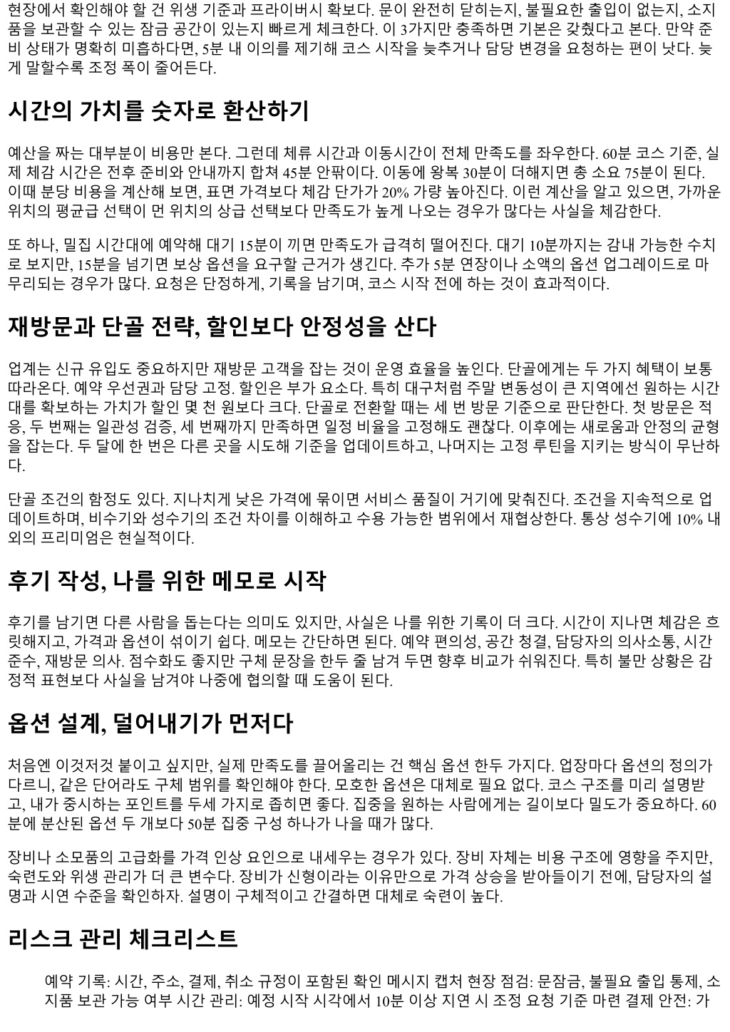 현장에서확인해야할건위생기준과프라이버시확보다. 문이완전히닫히는지, 불필요한출입이없는지, 소지 품을보관할수있는잠금공간이있는지빠르게체크한다. 이 3가지만충족하면기본은갖췄다고본다. 만약준 비상태가명확히미흡하다면, 5분내이의를제기해코스시작을늦추거나담당변경을요청하는편이낫다. 늦 게말할수록조정폭이줄어든다. 시간의가치를숫자로환산하기 예산을짜는대부분이비용만본다. 그런데체류시간과이동시간이전체만족도를좌우한다. 60분코스기준, 실 제체감시간은전후준비와안내까지합쳐 45분안팎이다. 이동에왕복 30분이더해지면총소요 75분이된다. 이때분당비용을계산해보면, 표면가격보다체감단가가 20% 가량높아진다. 이런계산을알고있으면, 가까운 위치의평균급선택이먼위치의상급선택보다만족도가높게나오는경우가많다는사실을체감한다. 또하나, 밀집시간대에예약해대기 15분이끼면만족도가급격히떨어진다. 대기 10분까지는감내가능한수치 로보지만, 15분을넘기면보상옵션을요구할근거가생긴다. 추가 5분연장이나소액의옵션업그레이드로마 무리되는경우가많다. 요청은단정하게, 기록을남기며, 코스시작전에하는것이효과적이다. 재방문과단골전략, 할인보다안정성을산다 업계는신규유입도중요하지만재방문고객을잡는것이운영효율을높인다. 단골에게는두가지혜택이보통 따라온다. 예약우선권과담당고정. 할인은부가요소다. 특히대구처럼주말변동성이큰지역에선원하는시간 대를확보하는가치가할인몇천원보다크다. 단골로전환할때는세번방문기준으로판단한다. 첫방문은적 응, 두번째는일관성검증, 세번째까지만족하면일정비율을고정해도괜찮다. 이후에는새로움과안정의균형 을잡는다. 두달에한번은다른곳을시도해기준을업데이트하고, 나머지는고정루틴을지키는방식이무난하 다. 단골조건의함정도있다. 지나치게낮은가격에묶이면서비스품질이거기에맞춰진다. 조건을지속적으로업 데이트하며, 비수기와성수기의조건차이를이해하고수용가능한범위에서재협상한다. 통상성수기에 10% 내 외의프리미엄은현실적이다. 후기작성, 나를위한메모로시작 후기를남기면다른사람을돕는다는의미도있지만, 사실은나를위한기록이더크다. 시간이지나면체감은흐 릿해지고, 가격과옵션이섞이기쉽다. 메모는간단하면된다. 예약편의성, 공간청결, 담당자의의사소통, 시간 준수, 재방문의사. 점수화도좋지만구체문장을한두줄남겨두면향후비교가쉬워진다. 특히불만상황은감 정적표현보다사실을남겨야나중에협의할때도움이된다. 옵션설계, 덜어내기가먼저다 처음엔이것저것붙이고싶지만, 실제만족도를끌어올리는건핵심옵션한두가지다. 업장마다옵션의정의가 다르니, 같은단어라도구체범위를확인해야한다. 모호한옵션은대체로필요없다. 코스구조를미리설명받 고, 내가중시하는포인트를두세가지로좁히면좋다. 집중을원하는사람에게는길이보다밀도가중요하다. 60 분에분산된옵션두개보다 50분집중구성하나가나을때가많다. 장비나소모품의고급화를가격인상요인으로내세우는경우가있다. 장비자체는비용구조에영향을주지만, 숙련도와위생관리가더큰변수다. 장비가신형이라는이유만으로가격상승을받아들이기전에, 담당자의설 명과시연수준을확인하자. 설명이구체적이고간결하면대체로숙련이높다. 리스크관리체크리스트 예약기록: 시간, 주소, 결제, 취소규정이포함된확인메시지캡처현장점검: 문잠금, 불필요출입통제, 소 지품보관가능여부시간관리: 예정시작시각에서 10분이상지연시조정요청기준마련결제안전: 가