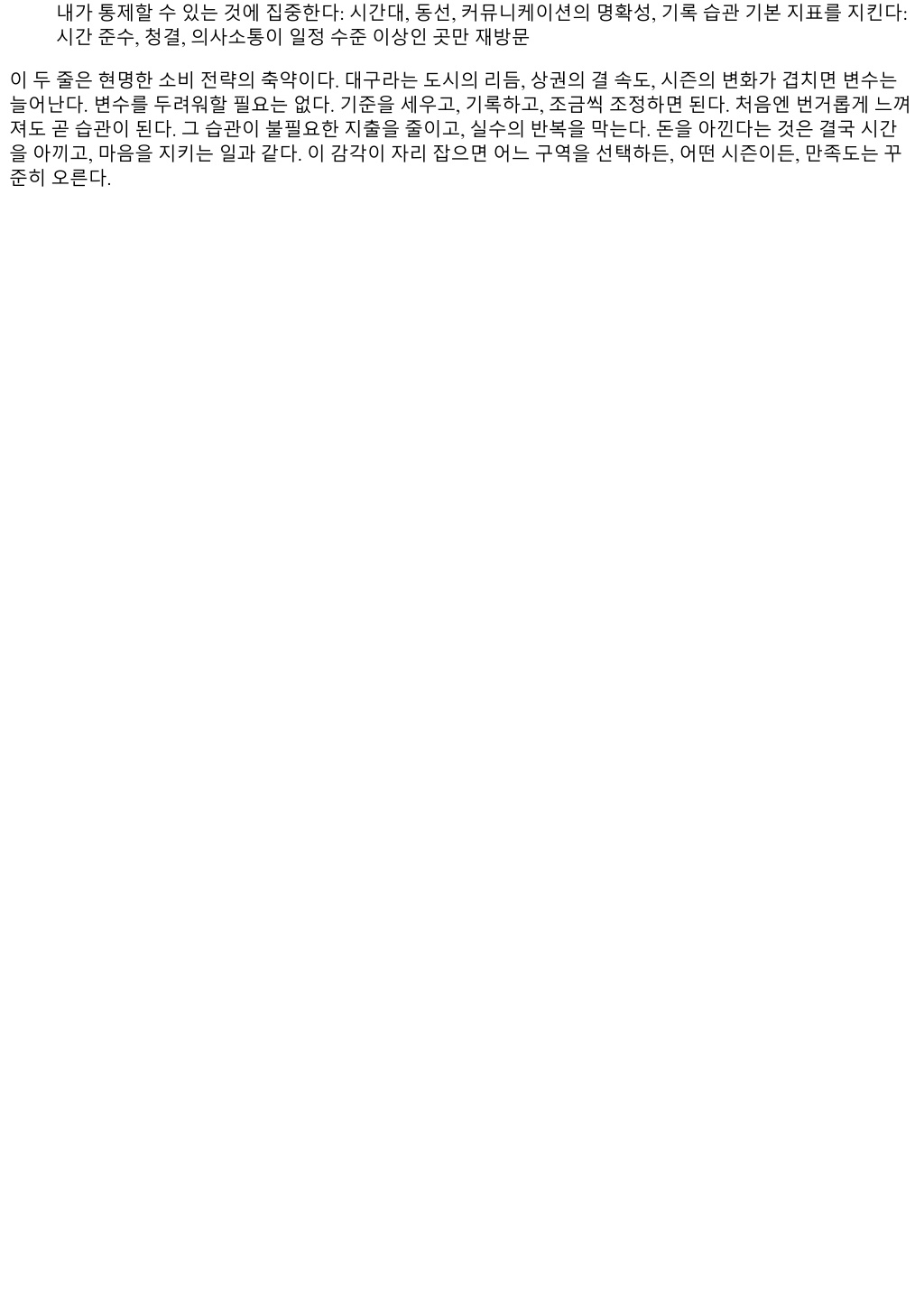 내가통제할수있는것에집중한다: 시간대, 동선, 커뮤니케이션의명확성, 기록습관기본지표를지킨다: 시간준수, 청결, 의사소통이일정수준이상인곳만재방문 이두줄은현명한소비전략의축약이다. 대구라는도시의리듬, 상권의결속도, 시즌의변화가겹치면변수는 늘어난다. 변수를두려워할필요는없다. 기준을세우고, 기록하고, 조금씩조정하면된다. 처음엔번거롭게느껴 져도곧습관이된다. 그습관이불필요한지출을줄이고, 실수의반복을막는다. 돈을아낀다는것은결국시간 을아끼고, 마음을지키는일과같다. 이감각이자리잡으면어느구역을선택하든, 어떤시즌이든, 만족도는꾸 준히오른다.