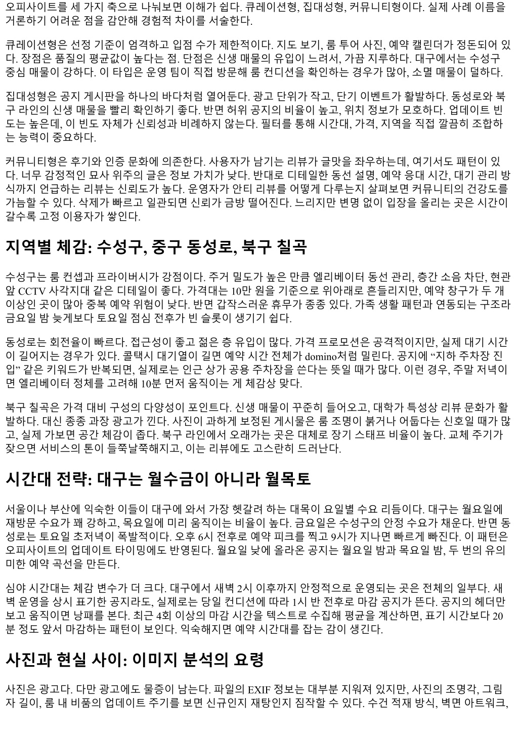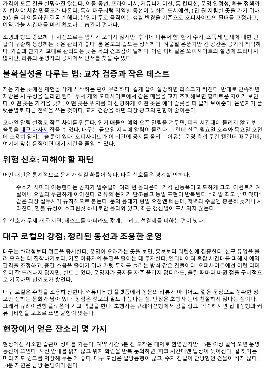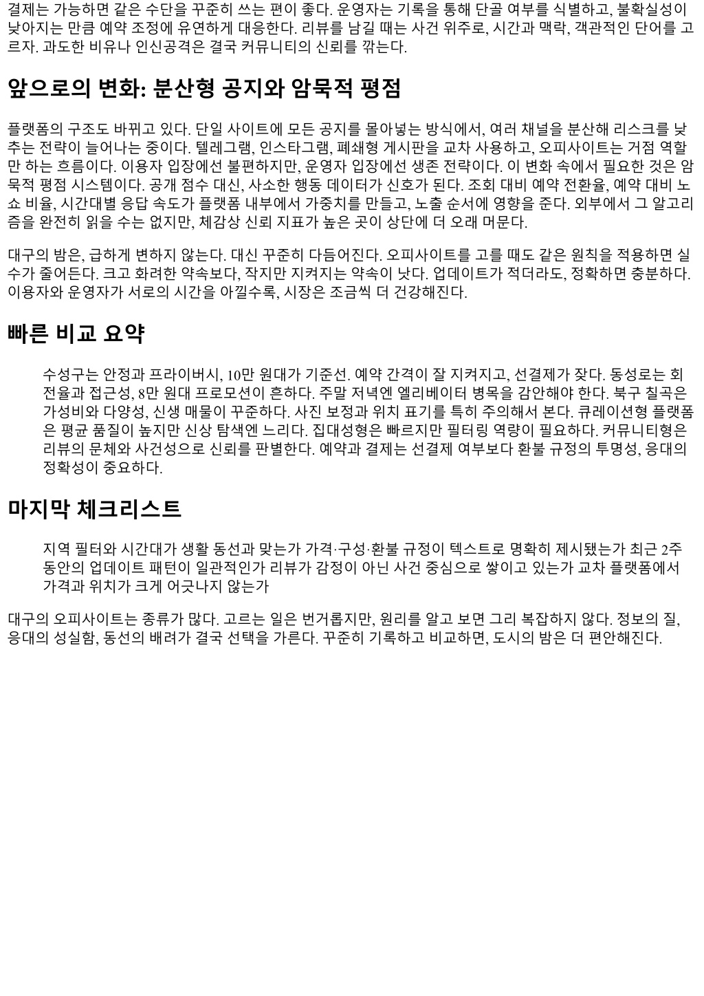 대구의밤은체계가있다. 도시규모에비해보수적이라는이미지가따라붙지만, 정작어둠이내려앉은뒤의선 택지는파편처럼흩어져있고, 그만큼선택의피로도도크다. 오피사이트는그조각을모으는지도역할을해왔 다. 다만지도는정확해야유용하다. 이글은최근 18개월동안대구주요지역에서관찰한흐름, 플랫폼별장단, 규제환경, 가격대, 수요이동, 그리고현장감각을바탕으로오피사이트의실전활용법을정리한보고서다. 상업 적홍보나근거없는푸시는배제하고, 숫자와사례, 교차검증을우선했다. 대구야간수요의지형도 대구는구도심과신도심이공존한다. 수성구의고급아파트벨트, 동성로중심상권, 범어와만촌의주거중심지, 북구대학가와공단, 그리고서대구역을축으로한교통허브까지, 동선은분화돼있다. 사람들이밤에어디서모 이고무엇을찾는지파악하려면, 우선이동데이터를읽어야한다. 야간심야시간대지하철환승량이줄어든만 큼, 택시콜비중이늘었고, 승하차지점은수성구 - 중구동성로 - 북구칠곡라인이두드러진다. 즉, 소비의밀도 가한곳에몰리지않고삼각형으로나뉜다. 이구조는오피사이트의정보구조에도흔적을남긴다. 지역필터가촘촘할수록, 수성구·중구·북구를별개시장 처럼다루는사이트가유리하다. 반대로광역카테고리만두고세부라벨링이느슨한곳은체감정확도가떨어 진다. 현장에서만난업주들사이에선중구기준으로공지가올라온뒤실제영업은수성구로옮겨가는사례가 반복된다. 주소마스킹, 특정층수비공개같은관성적익명성문화때문인데, 이럴수록리뷰단서와시간대패턴 을읽는역량이중요하다. 규제와회색지대, 그리고게시물의언어 오피사이트는본질적으로회색지대의정보를매개한다. 플랫폼운영자들은법적위험을줄이기위해표현을점 점우회적으로바꾼다. 몇년전만해도직설적인용어가많았지만최근엔웰니스, 힐링, 케어, 디퓨저, 테라피같 은완충어가앞세워진다. 게시물의문체는두방향으로갈라지는데, 사진중심의심플한카드형공지와, 스토리 텔링을통해차별화를노리는롱폼공지다. 전자는업데이트가자주된다. 후자는개별관리자역량이품질을좌 우한다. 어떤사이트가신뢰할수있는지판단하려면단어선택을디테일하게봐야한다. 시간대표기와가격대가정합 적인지, 결제안내가반복적으로변경되는지, 예약마감문구가매주동일한요일에반복되는지같은리듬을체 크한다. 실제운영매물이있는곳은일정주기가깔끔하다. 반대로유도게시물은시간과요일, 이벤트가과도하 게유연하게바뀌는경향이있다. 운영자의오탈자패턴도실마리다. 특정맞춤법오류가여러계정에동시반복 되면같은광고대행풀일가능성이높다. 가격대와구성: 대구의가성비기준선 가격은시장의심리다. 대구의평균적인기본구성은 60분단위기준으로움직인다. 지역별로편차가있지만, 실 제지갑에서나가는금액은다음네구간으로갈린다. 6만원대: 북구대학가, 공단인근, 신생매물의첫주홍보. 구성은베이직중심, 옵션선택권이좁다. 8만원 대: 동성로와달구벌대로축의준메인. 첫방문자유입과재방문밸런스가괜찮다. 10만원대: 수성구, 범어, 황금동일대의스탠더드. 루틴이안정적이고예약타임이잘지켜진다. 12만원이상: 프라이빗컨셉, 룸컨 디션과동선분리가확실한곳. 예약선결제가잦고, There-and-Back 이동이적다. 가격만으로품질을가늠하기는어렵다. 그런데일정기간트래픽과리뷰를따라가면공통점이보인다. 8만원대 가가장탄력적이다. 수요가몰리는금요일과토요일초저녁, 그리고월요일저녁재방문수요가교차하는구간 에서 8만원대매물의예약이먼저마감된다. 10만원대는평일심야에단골위주로조용히돌아간다. 12만원이 상은사진이선명하고룸컨셉이확실한경우만살아남는다. 인테리어만화려하고인력교체주기가혼란스러운 곳은한두달반짝한뒤조회수가줄어든다. 플랫폼유형별비교: 큐레이션 vs 집대성 vs 커뮤니티
