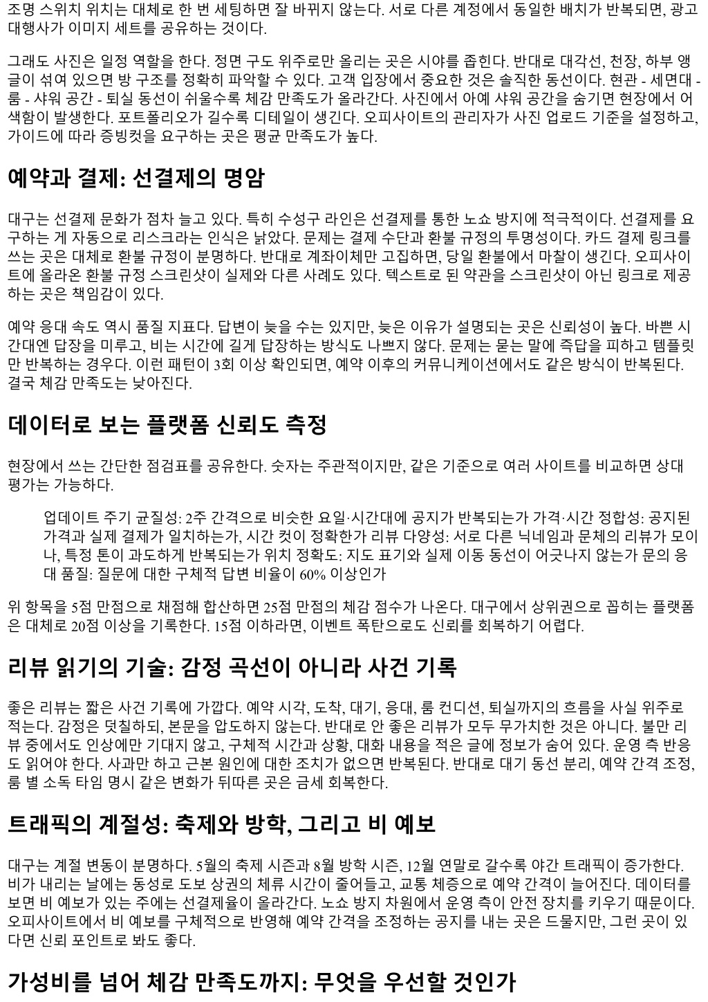 조명스위치위치는대체로한번세팅하면잘바뀌지않는다. 서로다른계정에서동일한배치가반복되면, 광고 대행사가이미지세트를공유하는것이다. 그래도사진은일정역할을한다. 정면구도위주로만올리는곳은시야를좁힌다. 반대로대각선, 천장, 하부앵 글이섞여있으면방구조를정확히파악할수있다. 고객입장에서중요한것은솔직한동선이다. 현관 - 세면대 - 룸 - 샤워공간 - 퇴실동선이쉬울수록체감만족도가올라간다. 사진에서아예샤워공간을숨기면현장에서어 색함이발생한다. 포트폴리오가길수록디테일이생긴다. 오피사이트의관리자가사진업로드기준을설정하고, 가이드에따라증빙컷을요구하는곳은평균만족도가높다. 예약과결제: 선결제의명암 대구는선결제문화가점차늘고있다. 특히수성구라인은선결제를통한노쇼방지에적극적이다. 선결제를요 구하는게자동으로리스크라는인식은낡았다. 문제는결제수단과환불규정의투명성이다. 카드결제링크를 쓰는곳은대체로환불규정이분명하다. 반대로계좌이체만고집하면, 당일환불에서마찰이생긴다. 오피사이 트에올라온환불규정스크린샷이실제와다른사례도있다. 텍스트로된약관을스크린샷이아닌링크로제공 하는곳은책임감이있다. 예약응대속도역시품질지표다. 답변이늦을수는있지만, 늦은이유가설명되는곳은신뢰성이높다. 바쁜시 간대엔답장을미루고, 비는시간에길게답장하는방식도나쁘지않다. 문제는묻는말에즉답을피하고템플릿 만반복하는경우다. 이런패턴이 3회이상확인되면, 예약이후의커뮤니케이션에서도같은방식이반복된다. 결국체감만족도는낮아진다. 데이터로보는플랫폼신뢰도측정 현장에서쓰는간단한점검표를공유한다. 숫자는주관적이지만, 같은기준으로여러사이트를비교하면상대 평가는가능하다. 업데이트주기균질성: 2주간격으로비슷한요일·시간대에공지가반복되는가가격·시간정합성: 공지된 가격과실제결제가일치하는가, 시간컷이정확한가리뷰다양성: 서로다른닉네임과문체의리뷰가모이 나, 특정톤이과도하게반복되는가위치정확도: 지도표기와실제이동동선이어긋나지않는가문의응 대품질: 질문에대한구체적답변비율이 60% 이상인가 위항목을 5점만점으로채점해합산하면 25점만점의체감점수가나온다. 대구에서상위권으로꼽히는플랫폼 은대체로 20점이상을기록한다. 15점이하라면, 이벤트폭탄으로도신뢰를회복하기어렵다. 리뷰읽기의기술: 감정곡선이아니라사건기록 좋은리뷰는짧은사건기록에가깝다. 예약시각, 도착, 대기, 응대, 룸컨디션, 퇴실까지의흐름을사실위주로 적는다. 감정은덧칠하되, 본문을압도하지않는다. 반대로안좋은리뷰가모두무가치한것은아니다. 불만리 뷰중에서도인상에만기대지않고, 구체적시간과상황, 대화내용을적은글에정보가숨어있다. 운영측반응 도읽어야한다. 사과만하고근본원인에대한조치가없으면반복된다. 반대로대기동선분리, 예약간격조정, 룸별소독타임명시같은변화가뒤따른곳은금세회복한다. 트래픽의계절성: 축제와방학, 그리고비예보 대구는계절변동이분명하다. 5월의축제시즌과 8월방학시즌, 12월연말로갈수록야간트래픽이증가한다. 비가내리는날에는동성로도보상권의체류시간이줄어들고, 교통체증으로예약간격이늘어진다. 데이터를 보면비예보가있는주에는선결제율이올라간다. 노쇼방지차원에서운영측이안전장치를키우기때문이다. 오피사이트에서비예보를구체적으로반영해예약간격을조정하는공지를내는곳은드물지만, 그런곳이있 다면신뢰포인트로봐도좋다. 가성비를넘어체감만족도까지: 무엇을우선할것인가