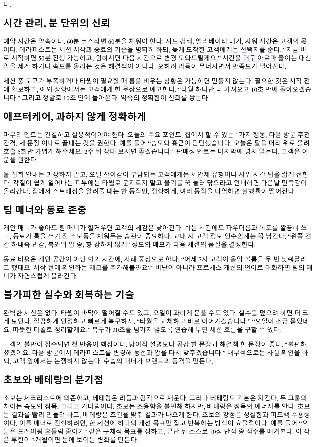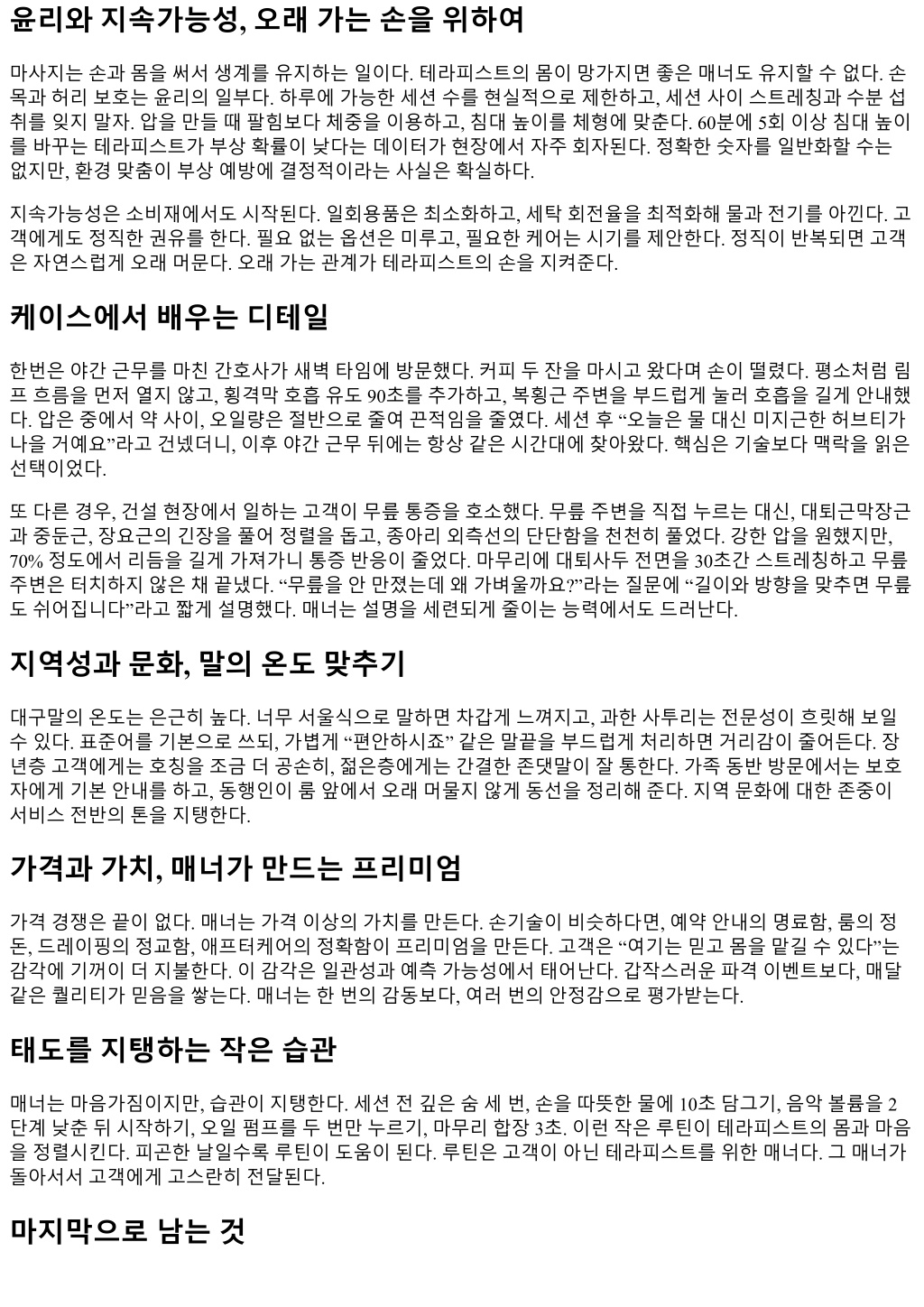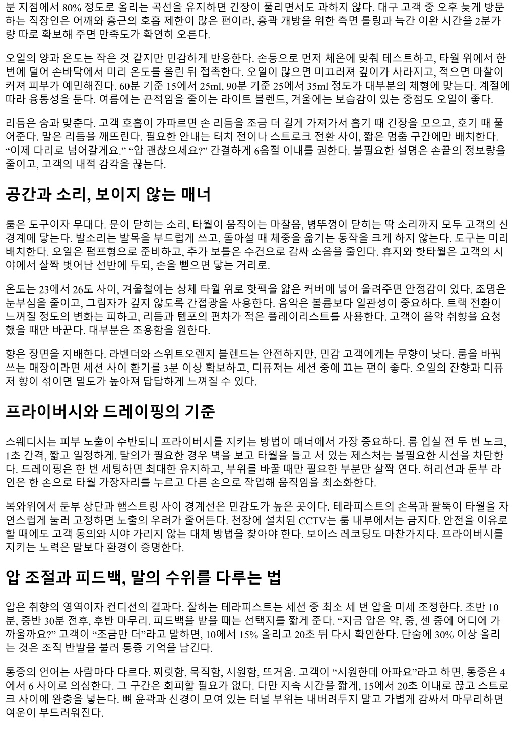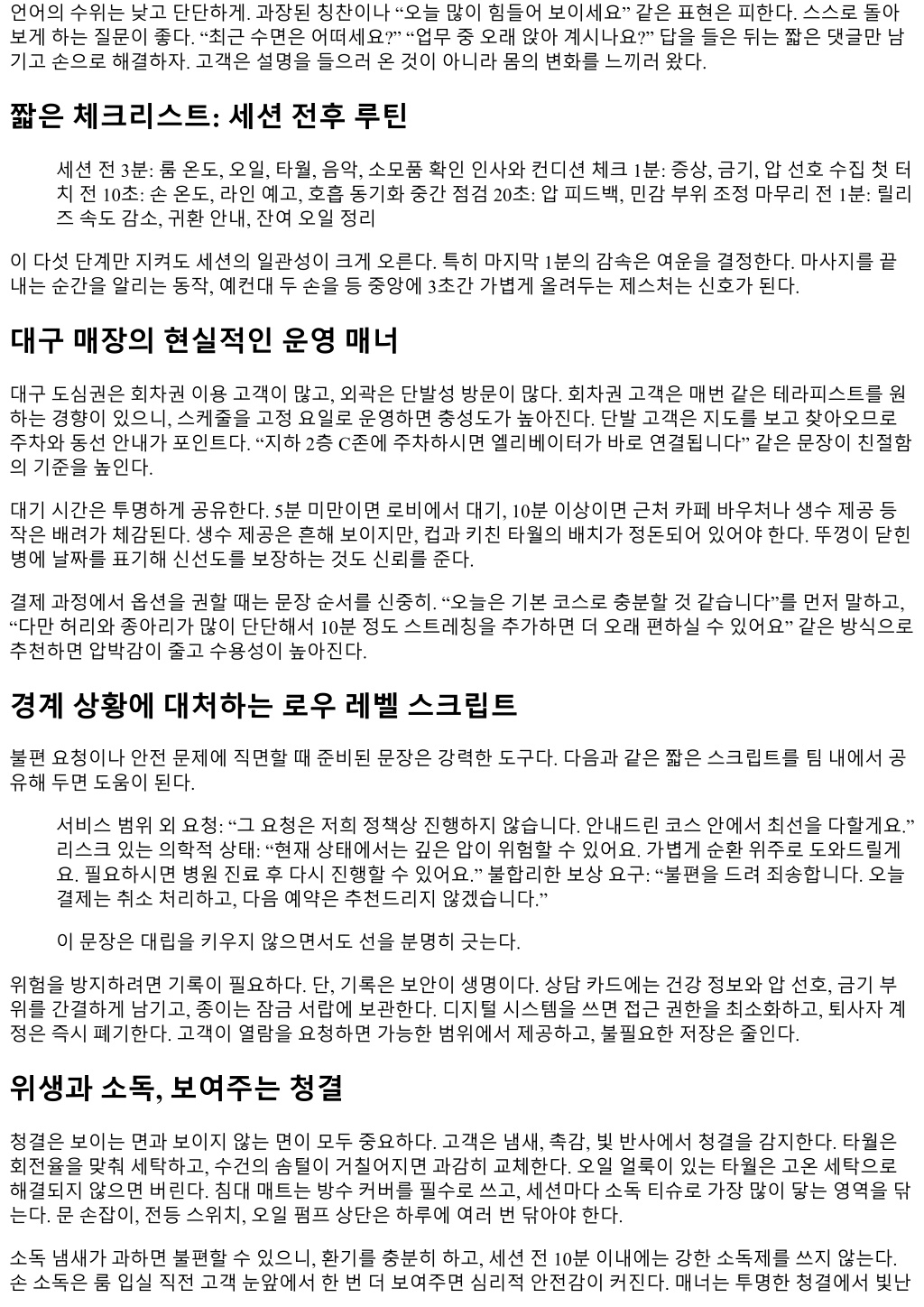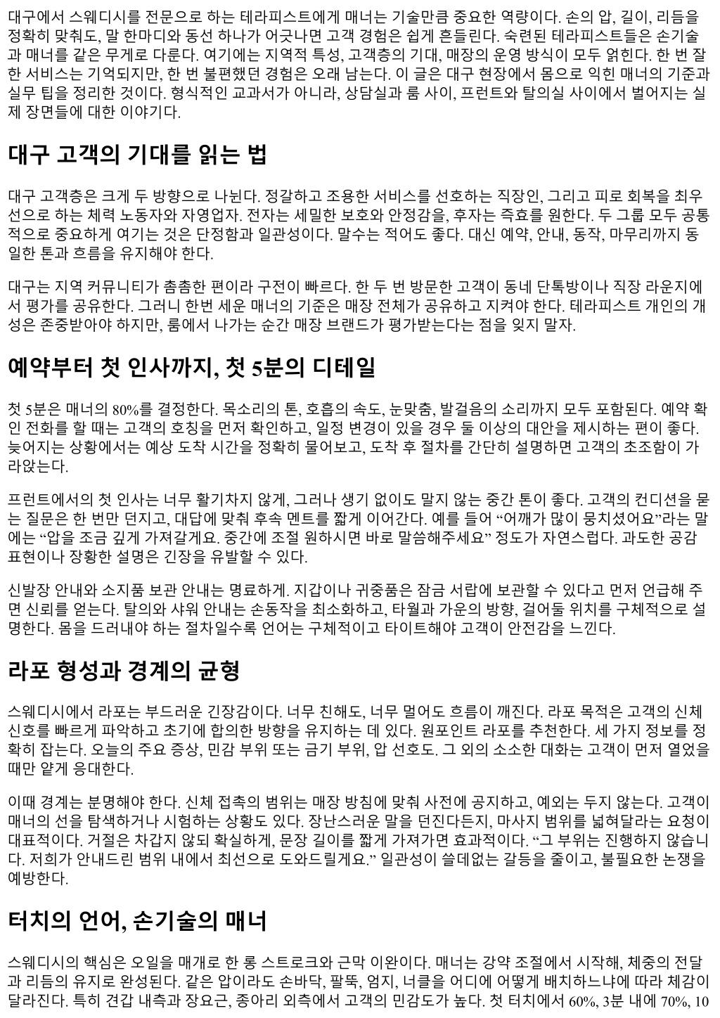 다. 시간관리, 분단위의신뢰 예약시간은약속이다. 60분코스라면 60분을채워야한다. 지도검색, 엘리베이터대기, 샤워시간은고객의몫 이다. 테라피스트는세션시작과종료의기준을명확히하되, 늦게도착한고객에게는선택지를준다. “지금바 로시작하면 50분진행가능하고, 원하시면다음시간으로변경도와드릴게요.” 시간을대구아로마줄이는대신 압을세게하거나속도를올리는것은해결책이아니다. 오히려리듬이무너지면서만족도가떨어진다. 세션중도구가부족하거나타월이필요할때룸을비우는상황은가능하면만들지않는다. 필요한것은시작전 에확보하고, 예외상황에서는고객에게한문장으로예고한다. “타월하나만더가져오고 10초만에돌아오겠습 니다.” 그리고정말로 10초안에돌아온다. 약속의정확함이신뢰를쌓는다. 애프터케어, 과하지않게정확하게 마무리멘트는간결하고실용적이어야한다. 오늘의주요포인트, 집에서할수있는 1가지행동, 다음방문추천 간격. 세문장이내로끝내는것을권한다. 예를들어 “승모와흉근이단단했습니다. 오늘은팔을머리위로올려 호흡 5회만가볍게해주세요. 2주뒤상태보시면좋겠습니다.” 판매성멘트는마지막에넣지않는다. 고객은여 운을원한다. 물섭취안내는과장하지말고, 오일잔여감이부담되는고객에게는세안제유형이나샤워시간팁을짧게전한 다. 각질이쉽게일어나는피부에는타월로문지르지말고물기를꾹눌러닦으라고안내하면다음날만족감이 올라간다. 집에서스트레칭을알려줄때는한동작만, 정확하게. 여러동작을나열하면실행률이떨어진다. 팀매너와동료존중 개인매너가좋아도팀매너가헐거우면고객의체감은낮아진다. 쉬는시간에도파우더룸과복도를깔끔히쓰 고, 동료가룸을쓰기전소모품을채워두는습관이중요하다. 교대시고객정보인수인계는꼭남긴다. “왼쪽견 갑하내측민감, 복와위압중, 향강하지않게” 정도의메모가다음세션의품질을결정한다. 동료비평은개인공간이아닌회의시간에, 사례중심으로한다. “어제 7시고객이음악볼륨을두번낮춰달라 고했대요. 시작전에확인하는체크를추가해볼까요?” 비난이아니라프로세스개선의언어로대화하면팀의매 너가자연스럽게올라간다. 불가피한실수와회복하는기술 완벽한세션은없다. 타월이바닥에떨어질수도있고, 오일이과하게묻을수도있다. 실수를덮으려하면더크 게보인다. 깔끔하게인정하고빠르게복구하자. “타월을교체하고바로이어가겠습니다.” “오일이조금묻었네 요. 따뜻한타월로정리할게요.” 복구가 20초를넘기지않도록연습해두면세션흐름을구할수있다. 고객의불만이접수되면첫반응이핵심이다. 방어적설명보다공감한문장과해결책한문장이좋다. “불편하 셨겠어요. 다음방문에서테라피스트를변경해동선과압을다시맞추겠습니다.” 내부적으로는사실확인을하 되, 고객앞에서는논쟁하지않는다. 수습의매너가브랜드의품격을만든다. 초보와베테랑의분기점 초보는체크리스트에의존하고, 베테랑은리듬과감각으로채운다. 그러나베테랑도기본은지킨다. 두그룹의 차이는속도와침묵, 그리고기다림이다. 초보는조용함을불편해하지만, 베테랑은침묵의에너지를안다. 초보 는결과를빨리만들려하고, 베테랑은조건을맞춰결과가나오게한다. 초보의강점은성실함과피드백수용성 이다. 이를매너로전환하려면, 한세션에하나의개선목표만잡고반복하는방식이효율적이다. 예를들어 “오 늘은드레이핑흔들림줄이기” 같은구체적목표를정하고, 끝난뒤스스로 10점만점중점수를매겨본다. 이작 은루틴이 3개월이면눈에보이는변화를만든다.