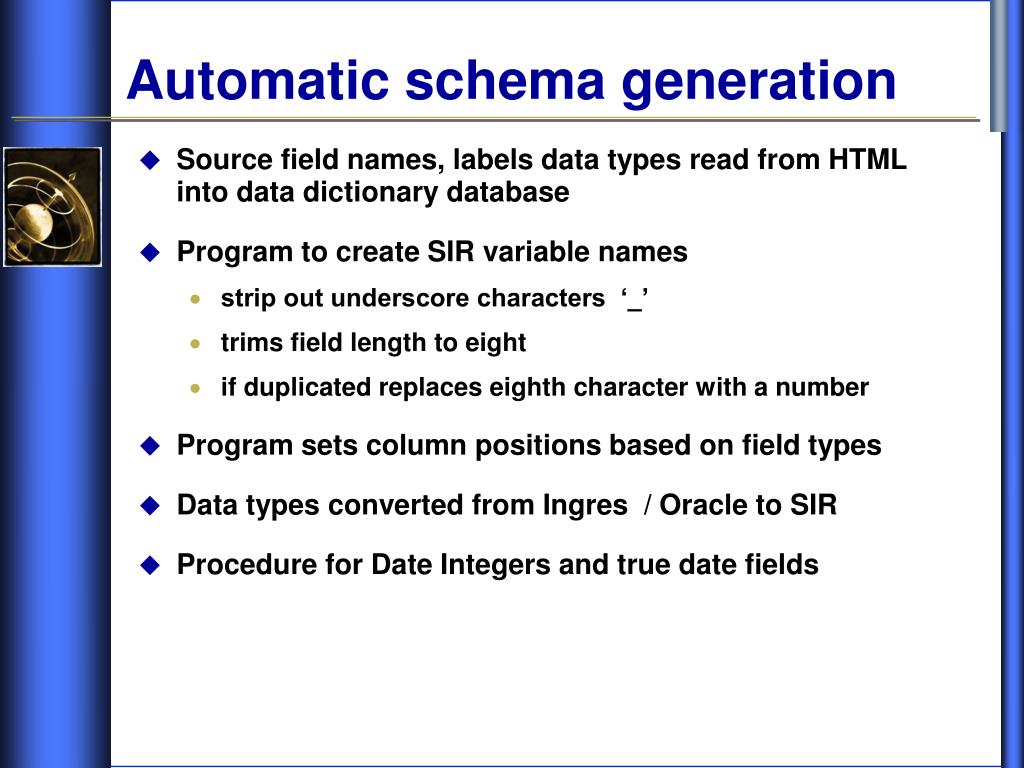 Automatic schema generation • Source field names, labels data types read from HTML into data dictionary database • Program to create SIR variable names • strip out underscore characters ‘_’ • trims field length to eight • if duplicated replaces eighth character with a number • Program sets column positions based on field types • Data types converted from Ingres / Oracle to SIR • Procedure for Date Integers and true date fields