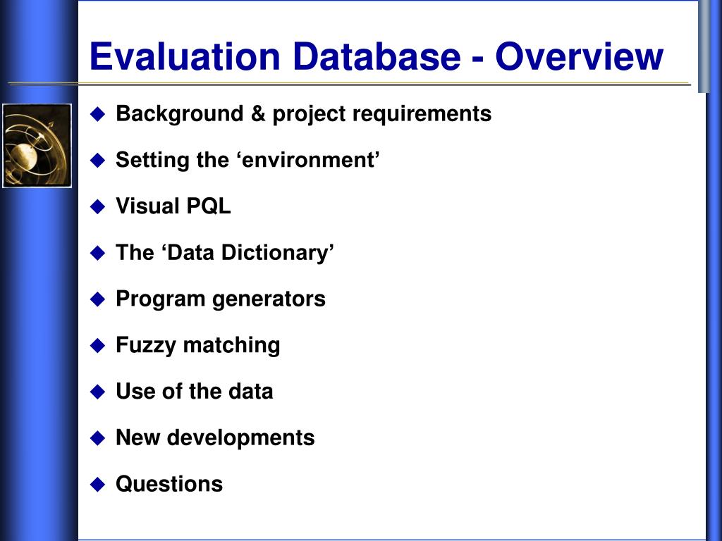 Evaluation Database - Overview • Background & project requirements • Setting the ‘environment’ • Visual PQL • The ‘Data Dictionary’ • Program generators • Fuzzy matching • Use of the data • New developments • Questions