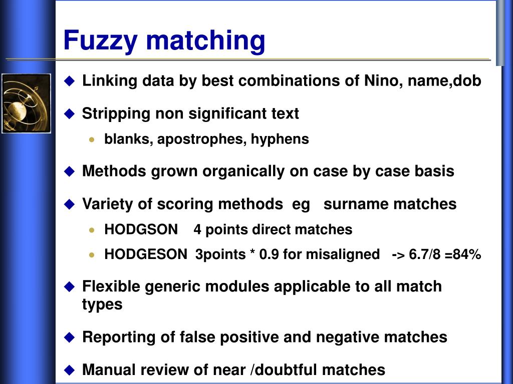 Fuzzy matching • Linking data by best combinations of Nino, name,dob • Stripping non significant text • blanks, apostrophes, hyphens • Methods grown organically on case by case basis • Variety of scoring methods eg surname matches • HODGSON 4 points direct matches • HODGESON 3points * 0.9 for misaligned -> 6.7/8 =84% • Flexible generic modules applicable to all match types • Reporting of false positive and negative matches • Manual review of near /doubtful matches