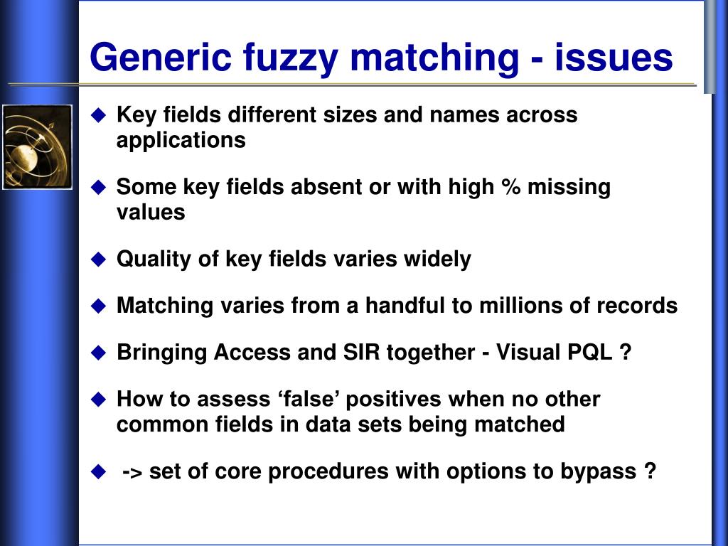 Generic fuzzy matching - issues • Key fields different sizes and names across applications • Some key fields absent or with high % missing values • Quality of key fields varies widely • Matching varies from a handful to millions of records • Bringing Access and SIR together - Visual PQL ? • How to assess ‘false’ positives when no other common fields in data sets being matched • -> set of core procedures with options to bypass ?