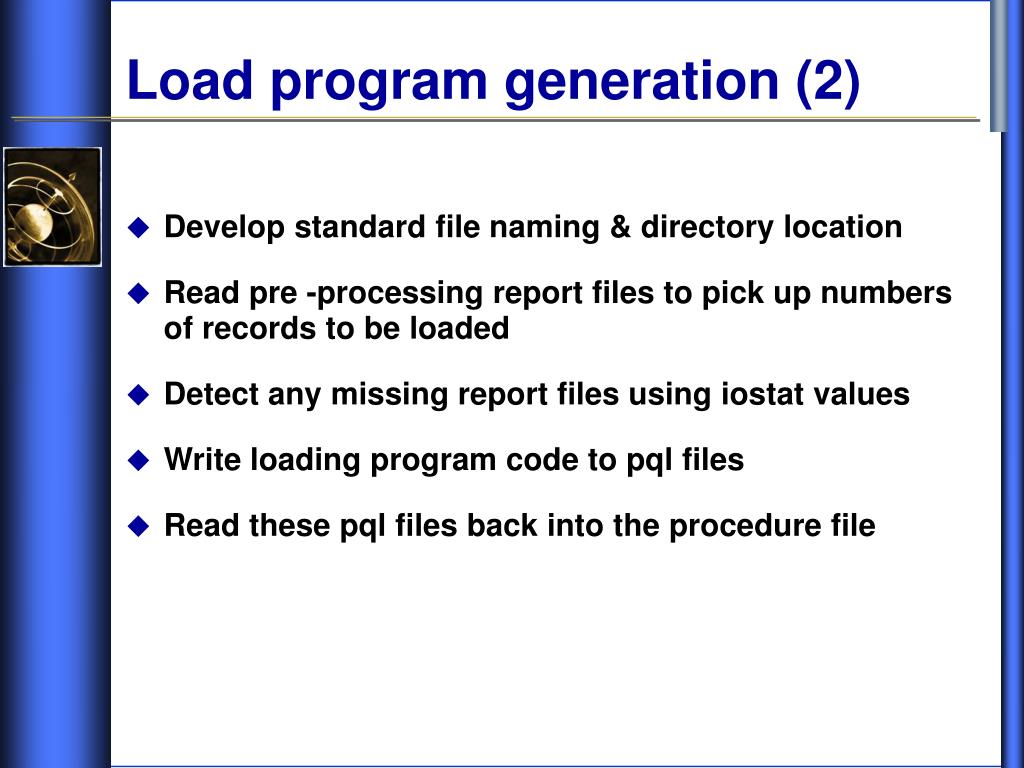 Load program generation (2) • Develop standard file naming & directory location • Read pre -processing report files to pick up numbers of records to be loaded • Detect any missing report files using iostat values • Write loading program code to pql files • Read these pql files back into the procedure file