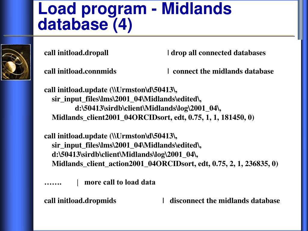 Load program - Midlands database (4) call initload.dropall | drop all connected databases call initload.connmids | connect the midlands database call initload.update (\\Urmston\d\50413\, sir_input_files\lms\2001_04\Midlands\edited\, d:\50413\sirdb\client\Midlands\log\2001_04\, Midlands_client2001_04ORCIDsort, edt, 0.75, 1, 1, 181450, 0) call initload.update (\\Urmston\d\50413\, sir_input_files\lms\2001_04\Midlands\edited\, d:\50413\sirdb\client\Midlands\log\2001_04\, Midlands_client_action2001_04ORCIDsort, edt, 0.75, 2, 1, 236835, 0) ……. | more call to load data call initload.dropmids | disconnect the midlands database