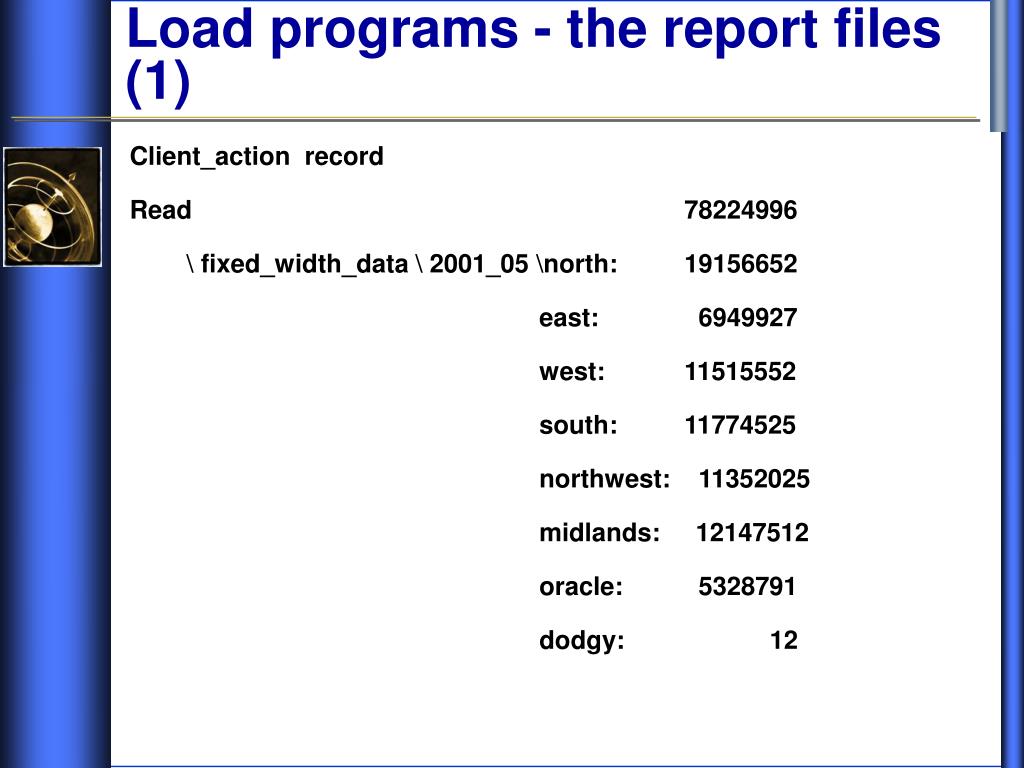 Load programs - the report files (1) Client_action record Read 78224996 \ fixed_width_data \ 2001_05 \north: 19156652 east: 6949927 west: 11515552 south: 11774525 northwest: 11352025 midlands: 12147512 oracle: 5328791 dodgy: 12