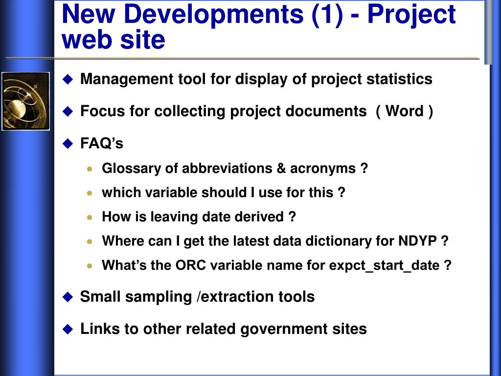 New Developments (1) - Project web site • Management tool for display of project statistics • Focus for collecting project documents ( Word ) • FAQ’s • Glossary of abbreviations & acronyms ? • which variable should I use for this ? • How is leaving date derived ? • Where can I get the latest data dictionary for NDYP ? • What’s the ORC variable name for expct_start_date ? • Small sampling /extraction tools • Links to other related government sites