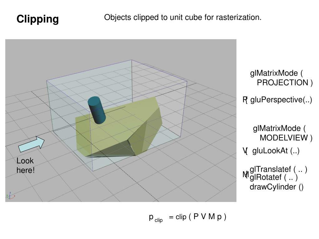 Clipping Objects clipped to unit cube for rasterization. glMatrixMode ( PROJECTION ) P { gluPerspective(..) glMatrixMode ( MODELVIEW ) V { gluLookAt (..) Look here! glTranslatef ( .. ) { M glRotatef ( .. ) drawCylinder () p = clip ( P V M p ) clip