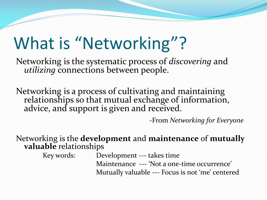 What is “Networking”? Networking is the systematic process of discovering and utilizing connections between people. Networking is a process of cultivating and maintaining relationships so that mutual exchange of information, advice, and support is given and received. -From Networking for Everyone Networking is the development and maintenance of mutually valuable relationships Key words: Development --- takes time Maintenance --- ‘Not a one-time occurrence’ Mutually valuable --- Focus is not ‘me’ centered