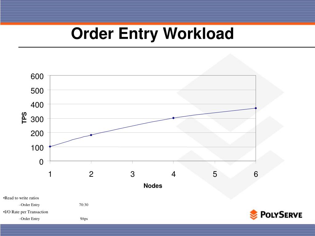 Order Entry Workload 600 500 400 TPS 300 200 100 0 1 2 3 4 5 6 Nodes • Read to write ratios • Order Entry 70:30 • I/O Rate per Transaction • Order Entry 9/tps