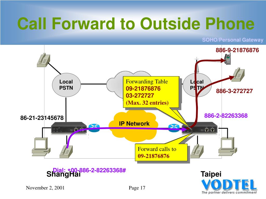 Forward calls to 021-23145678 IP Network Forward calls to 886-2-82263368 Call Forwards (Mobile Phone)Forward your mobile to remote phone Local PSTN Local PSTN 886-921-856868 Auto Forward 886-2-82263368 86-21-23145678 Taipei ShangHai Page 16