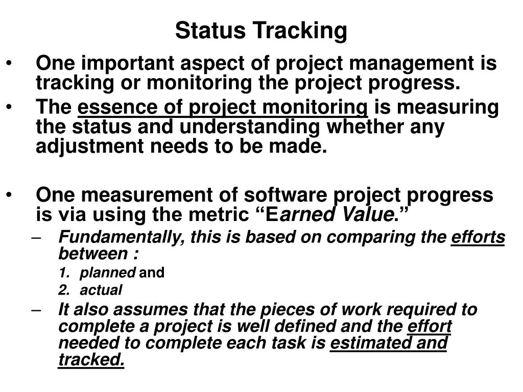 Status Tracking. One important aspect of project management is tracking or monitoring the project progress. The essence of project monitoring is measuring the status and understanding whether any adjustment needs to be made.