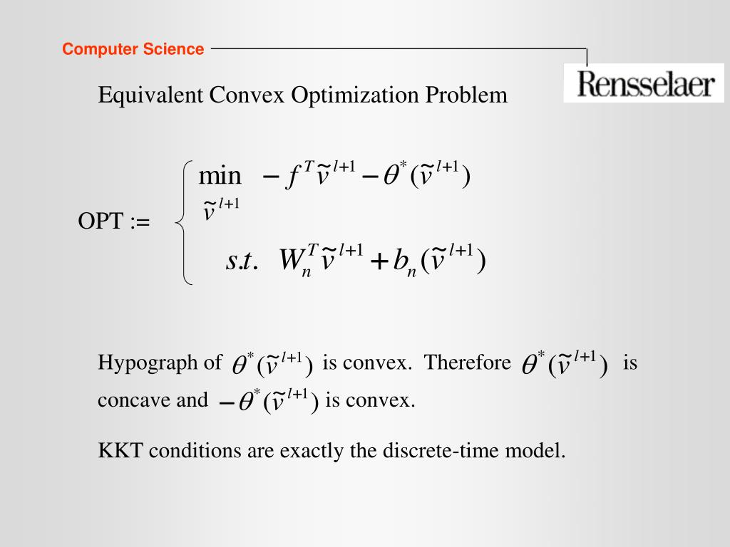 Equivalent Convex Optimization Problem OPT := Hypograph of is convex. Therefore is concave and is convex. KKT conditions are exactly the discrete-time model.
