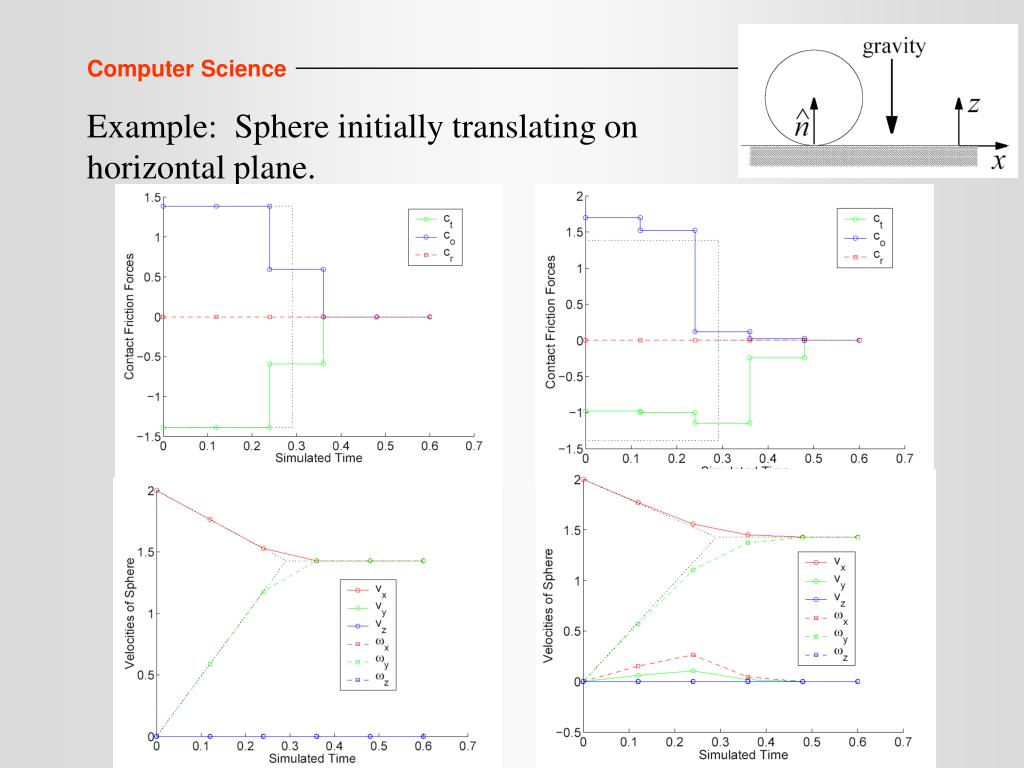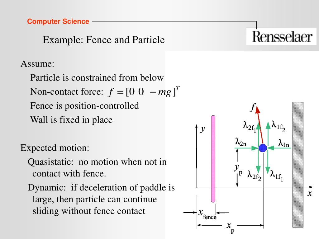 Example: Fence and Particle Assume: Particle is constrained from below Non-contact force: Fence is position-controlled Wall is fixed in place Expected motion: Quasistatic: no motion when not in contact with fence. Dynamic: if deceleration of paddle is large, then particle can continue sliding without fence contact