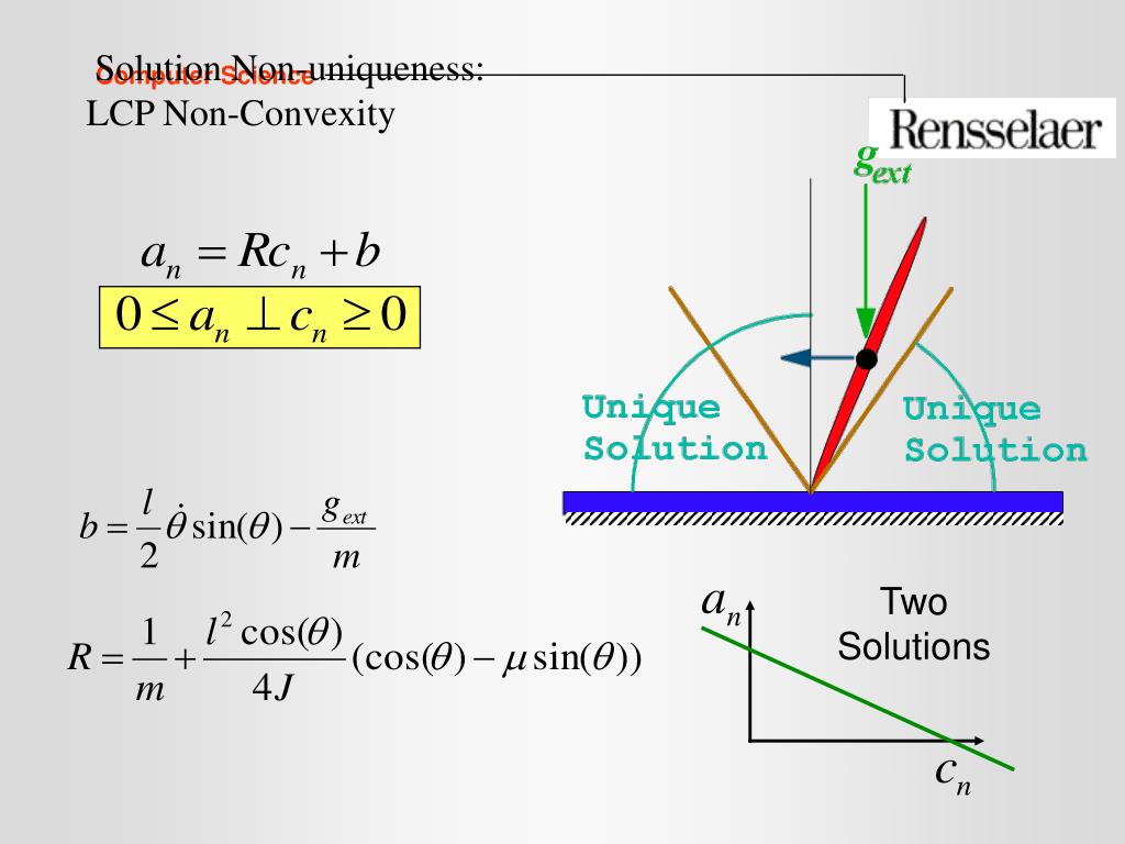 Solution Non-Uniqueness:Contact Force Null Space Both friction cones can “see” the other contact point. Assume: Blue discs are fixed in space Red disc is initially at rest Solution 1 – disc remains at rest Solution 2 – disc accelerates downward External Load