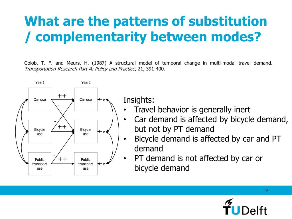 What are the patterns of substitution / complementarity between modes? Golob, T. F. and Meurs, H. (1987) A structural model of temporal change in multi-modal travel demand. Transportation Research Part A: Policy and Practice, 21, 391-400. Year1 Year2 Caruse Caruse ++ • Insights: • Travel behavior is generally inert • Car demand is affected by bicycle demand, but not by PT demand • Bicycle demand is affected by car and PT demand • PT demand is not affected by car or bicycle demand e - - Bicycle use Bicycle use ++ e - Public transport use Public transport use ++ e