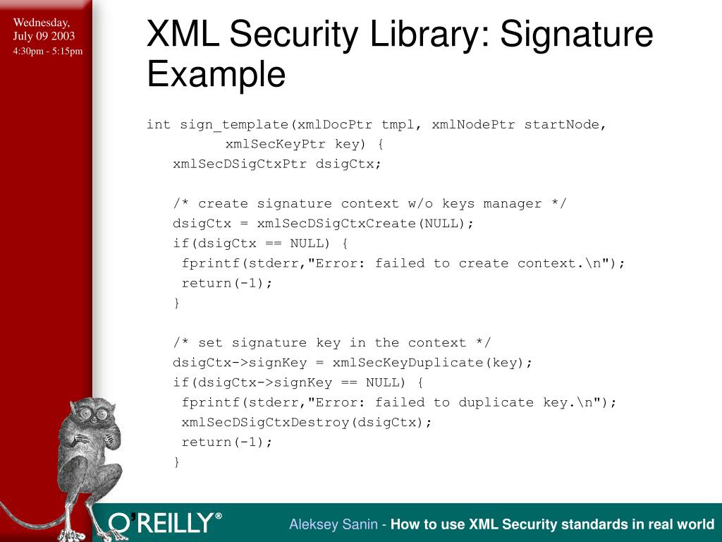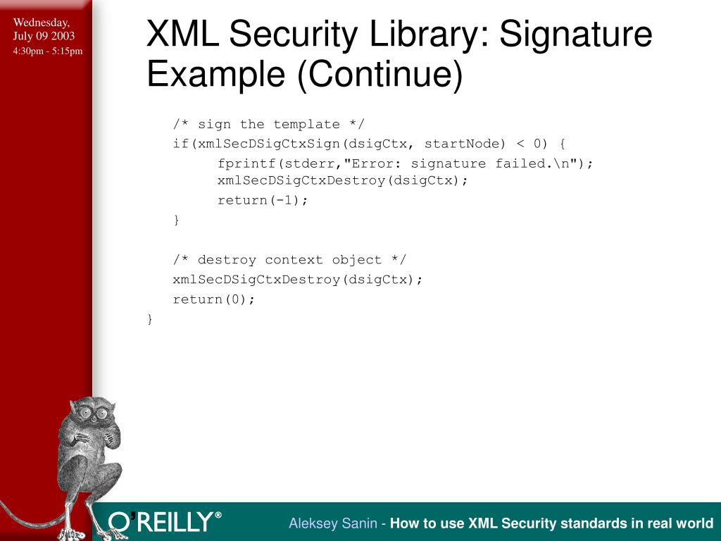XML Security Library: Signature Example (Continue) /* sign the template */ if(xmlSecDSigCtxSign(dsigCtx, startNode) < 0) { fprintf(stderr,"Error: signature failed.\n"); xmlSecDSigCtxDestroy(dsigCtx); return(-1); } /* destroy context object */ xmlSecDSigCtxDestroy(dsigCtx); return(0); }