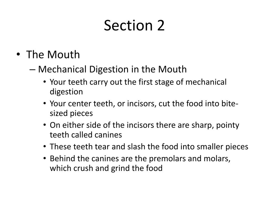 Section 2 • The Mouth • Mechanical Digestion in the Mouth • Your teeth carry out the first stage of mechanical digestion • Your center teeth, or incisors, cut the food into bite-sized pieces • On either side of the incisors there are sharp, pointy teeth called canines • These teeth tear and slash the food into smaller pieces • Behind the canines are the premolars and molars, which crush and grind the food