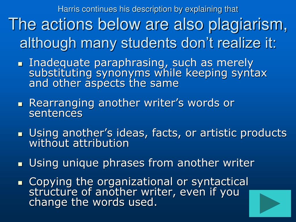Harris continues his description by explaining thatThe actions below are also plagiarism, although many students don’t realize it: • Inadequate paraphrasing, such as merely substituting synonyms while keeping syntax and other aspects the same • Rearranging another writer’s words or sentences • Using another’s ideas, facts, or artistic products without attribution • Using unique phrases from another writer • Copying the organizational or syntactical structure of another writer, even if you change the words used.