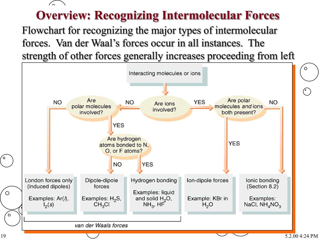 Overview: Recognizing Intermolecular Forces • Flowchart for recognizing the major types of intermolecular forces. Van der Waal’s forces occur in all instances. The strength of other forces generally increases proceeding from left to right