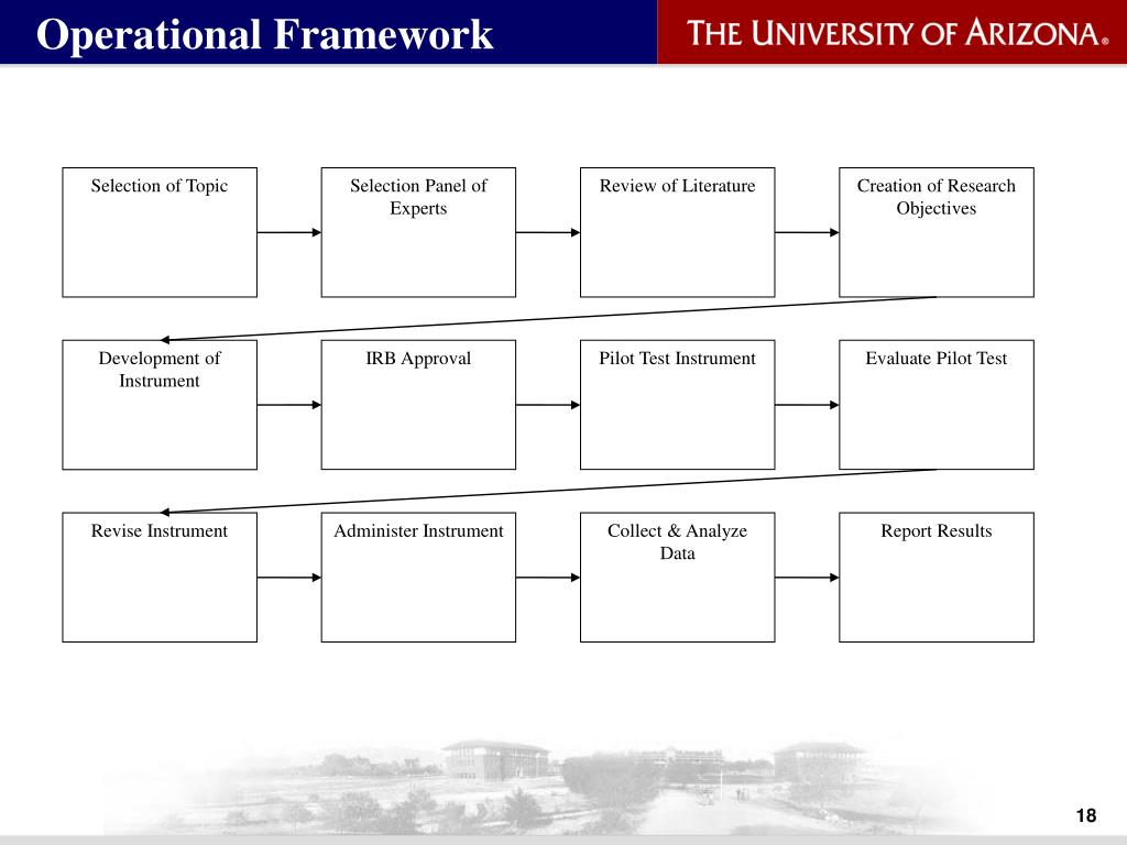 Selection of Topic Selection Panel of Experts Review of Literature Creation of Research Objectives Development of Instrument IRB Approval Pilot Test Instrument Evaluate Pilot Test Revise Instrument Administer Instrument Collect & Analyze Data Report Results Operational Framework