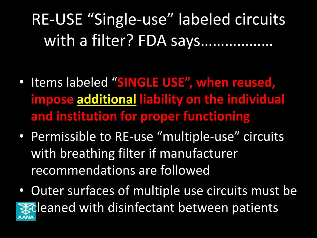 RE-USE “Single-use” labeled circuits with a filter? FDA says……………… • Items labeled “SINGLE USE”, when reused, impose additionalliability on the individual and institution for proper functioning • Permissible to RE-use “multiple-use” circuits with breathing filter if manufacturer recommendations are followed • Outer surfaces of multiple use circuits must be cleaned with disinfectant between patients