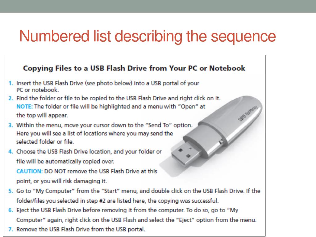 Instruction Format • Instructions come in a variety of formats. • Often use numbered lists. • Can use visuals: • - For certain steps. • - For the whole process. • Sometimes written in paragraphs.