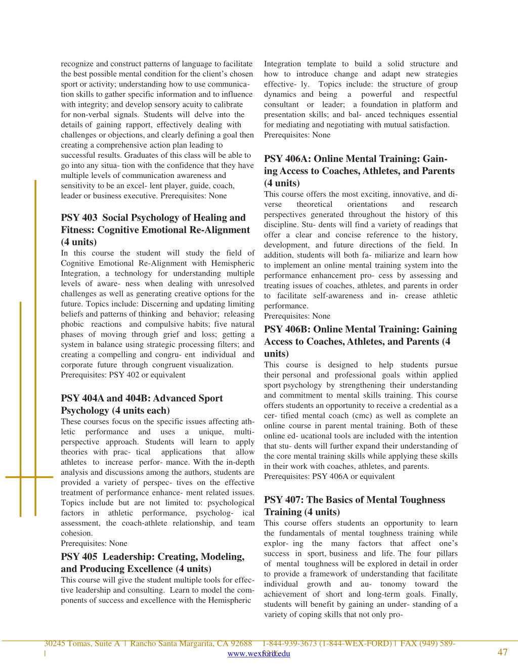 tual, occupational, physical, social, and spiritual factors. Wellness is an active, lifelong process that involves ex- panding knowledge, skills, values, practices, and sup- portive environments that increase one’s ability to enjoy a balanced and fulfilling life. Students will have a profound appreciation of this aspect of coaching upon completion of this course. Prerequisites: None can reach their highest moral and ethical efficiency. Top- ics include but are not limited to resolving ethical dilem- mas, self-regulation, and understanding challenges of psychology in practice. Prerequisites: None PSY 303: Foundations in Precision Com- munication Skills: Hemispheric Integration with Neuro-linguistics (NLP) (4 units) This course gives a foundation in the technology of Hemispheric Integration with neuro-linguistics. Hemi- spheric Integration bridges the gap between the science of how the brain processes information and practical ap- plications for building rapport, connection, and safety. Topics include both verbal and non-verbal communica- tion skills for gathering and delivering information effec- tively, precision goal setting, visualizing and motivating for success, and using each hemisphere of the brain for win-win results. Prerequisites: None PSY 111 Corporate Wellness Coaching (4 units) The corporate wellness coach course is designed to give students the tools to consult, educate, and be a hands-on coach for individuals and groups wanting to improve their wellness through all available and appropriate means. The Corporate Wellness Coach course is also designed to teach you how to manage and facilitate cor- porate wellness programs, required for success in work- place environments. This type of work is usually coor- dinated with corporate human resources departments and this is fundamental to the approach taken in this course; the student will learn to create a wellness culture within a corporate environment and to promote healthy behaviors in order to reduce company costs and improve the over- all morale of an organization. When paired with AA110, students greatly increase their effectiveness as a fitness professional. Prerequisites: PSY 110 or equivalent PSY 304: Cognitive & Affective Behavior (4 units) This course will explore the critical role emotion plays in one’s memory and cognitive processing. In working with athletes and performers from a variety of backgrounds, it is imperative to establish a firm understanding of the dynamic role between one’s thoughts, emotions, and be- haviors and their role in performance enhancement. Prerequisites: None PSY 204 Introduction to Sports Psychology (4 units) This course introduces foundational concepts and applied models in sport psychology. Topics include but are not limited to: goal setting, motivation, arousal/anxiety, cog- nitive effects of sport, and interventions to enhance sport and exercise performance. Prerequisites: PSY 104 or by instructor approval PSY 305: Foundations in Precision Communication Skills - Level 2 (4 units) This course continues with more of the foundation in the technology of Hemispheric Integration and neuro-linguis- tics. Hemispheric Integration bridges the gap between the science of how the brain processes information and practical applications for influencing with integrity. Top- ics include both verbal and non-verbal communication skills for gathering and delivering information effective- ly, motivating for success, decision making strategies and using each hemisphere of the brain for win-win results. Prerequisites: PSY 303 or equivalent PSY 301A & B: Intro to Sport Psychology (4 units) This course introduces foundational concepts in applied sport psychology and how they are applied to athletes and performers in a variety of different social, cultural, and environmental contexts. Topics include but are not lim- ited to personality and sport, group and team dynamics, and psychological skills training. Prerequisites: None PSY 306: Intro to Applied Sports Psychology (4 units) This course introduces foundational concepts in applied sport psychology and how they are applied to athletes and performers in a variety of different social, cultural, and environmental contexts. Topics include but are not lim- ited to personality and sport, group and team dynamics, PSY 302: Ethical Issues in Applied Sports Psychology (4 units) This course introduces a practical guide on the impor- tance of positive ethics and ways in which psychologists 30245 Tomas, Suite A | Rancho Santa Margarita, CA 92688 | 1-844-939-3673 (1-844-WEX-FORD) | FAX (949) 589-8216 45 www.wexford.edu