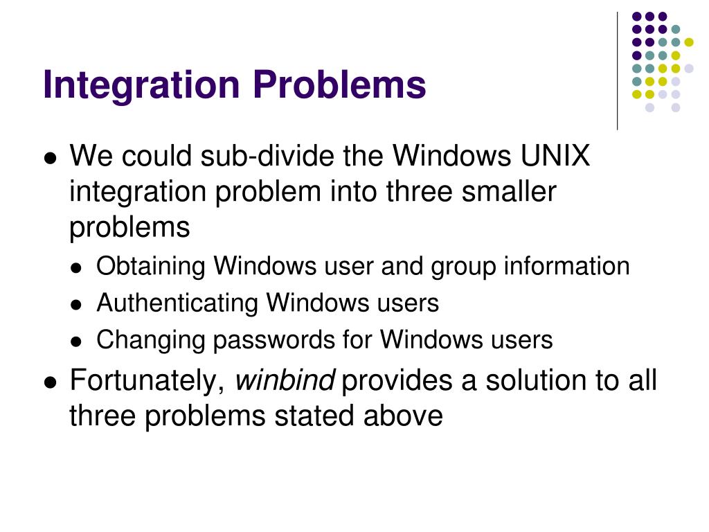 Integration Problems • We could sub-divide the Windows UNIX integration problem into three smaller problems • Obtaining Windows user and group information • Authenticating Windows users • Changing passwords for Windows users • Fortunately, winbind provides a solution to all three problems stated above