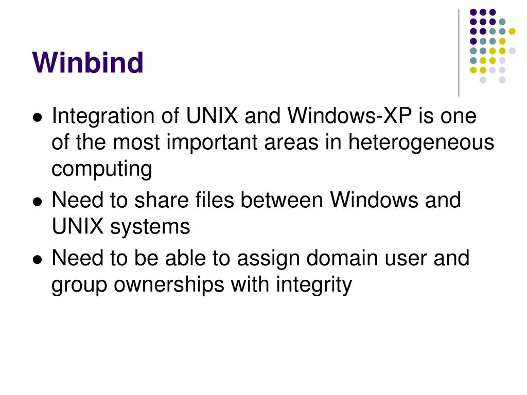 Winbind • Integration of UNIX and Windows-XP is one of the most important areas in heterogeneous computing • Need to share files between Windows and UNIX systems • Need to be able to assign domain user and group ownerships with integrity