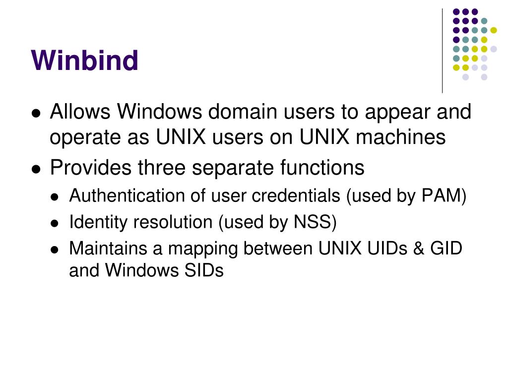 Winbind Users on the UNIX machine can use Windows user and group names as they would native UNIX names They are dynamically allocated UNIX uids/gids from a specified range They can chown files so they are owned by Windows users They can log into the UNIX machine or run a UNIX X-Window session as a Windows domain user