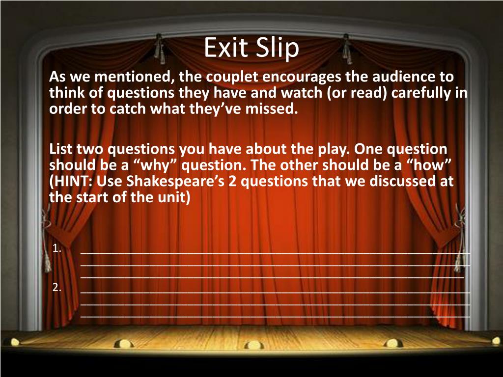 Exit Slip As we mentioned, the couplet encourages the audience to think of questions they have and watch (or read) carefully in order to catch what they’ve missed. List two questions you have about the play. One question should be a “why” question. The other should be a “how” (HINT: Use Shakespeare’s 2 questions that we discussed at the start of the unit) • _________________________________________________________________________________________________________________________________________________________________________________________ • __________________________________________________________________________________________________________________________________________________________________________________________