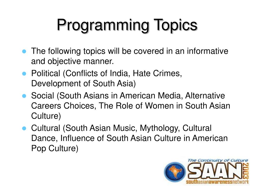 Programming Topics • The following topics will be covered in an informative and objective manner. • Political (Conflicts of India, Hate Crimes, Development of South Asia) • Social (South Asians in American Media, Alternative Careers Choices, The Role of Women in South Asian Culture) • Cultural (South Asian Music, Mythology, Cultural Dance, Influence of South Asian Culture in American Pop Culture)
