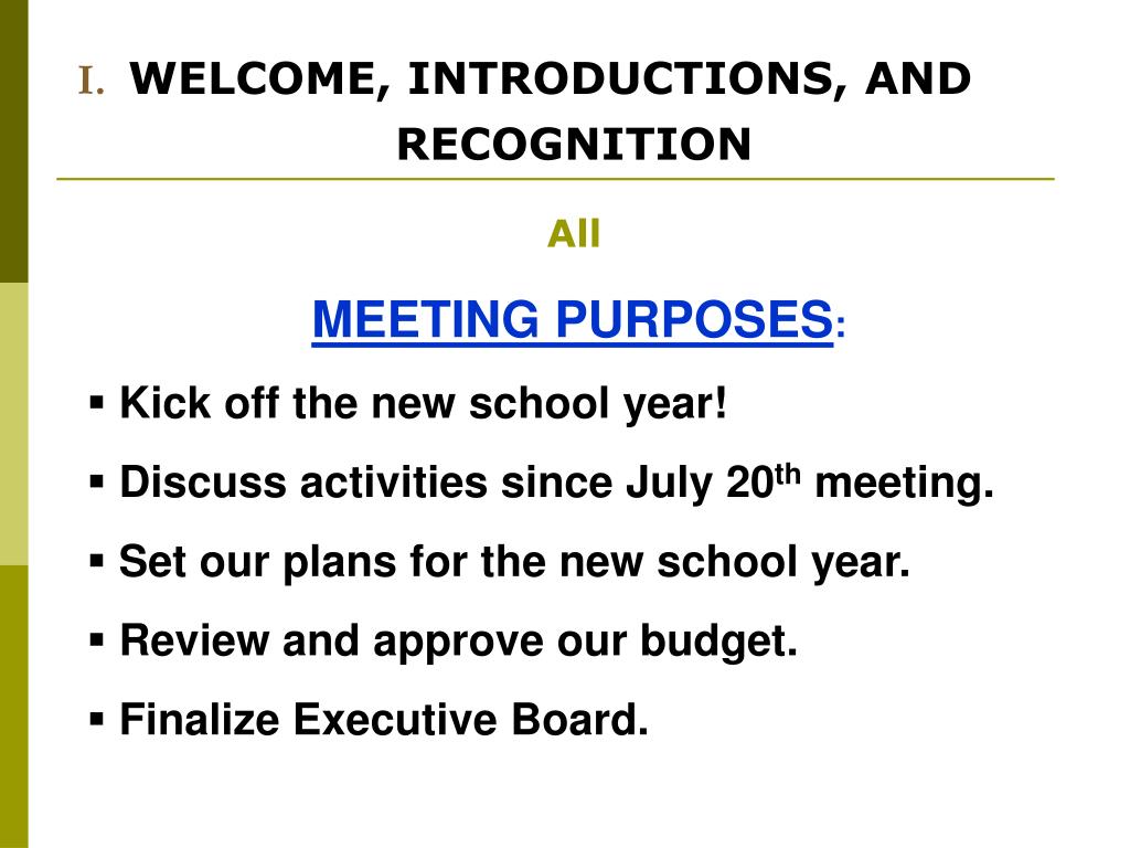 I.WELCOME, INTRODUCTIONS, AND RECOGNITION All • MEETING PURPOSES: • Kick off the new school year! • Discuss activities since July 20th meeting. • Set our plans for the new school year. • Review and approve our budget. • Finalize Executive Board.