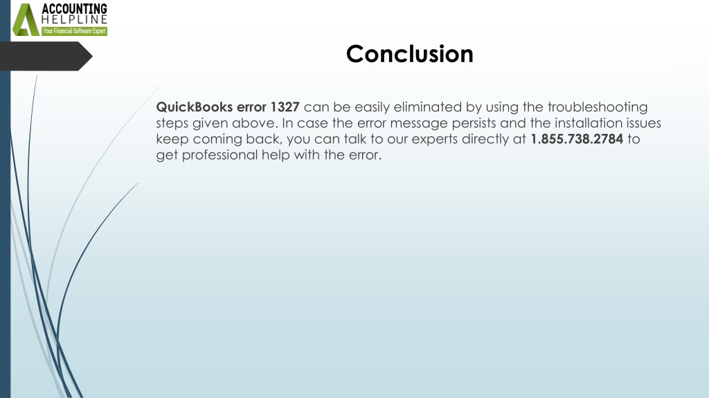 Conclusion QuickBooks error 1327 can be easily eliminated by using the troubleshooting steps given above. In case the error message persists and the installation issues keep coming back, you can talk to our experts directly at 1.855.738.2784 to get professional help with the error.