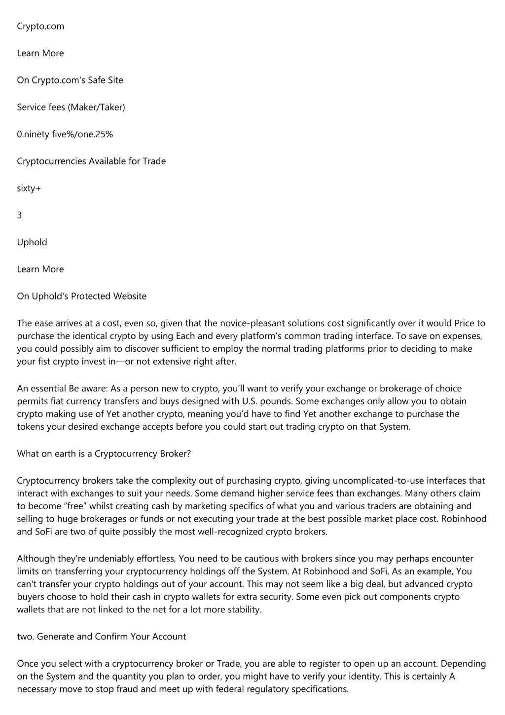 Crypto.com Learn More On Crypto.com's Safe Site Service fees (Maker/Taker) 0.ninety five%/one.25% Cryptocurrencies Available for Trade sixty+ 3 Uphold Learn More On Uphold's Protected Website The ease arrives at a cost, even so, given that the novice-pleasant solutions cost significantly over it would Price to purchase the identical crypto by using Each and every platform’s common trading interface. To save on expenses, you could possibly aim to discover sufficient to employ the normal trading platforms prior to deciding to make your fist crypto invest in—or not extensive right after. An essential Be aware: As a person new to crypto, you’ll want to verify your exchange or brokerage of choice permits fiat currency transfers and buys designed with U.S. pounds. Some exchanges only allow you to obtain crypto making use of Yet another crypto, meaning you’d have to find Yet another exchange to purchase the tokens your desired exchange accepts before you could start out trading crypto on that System. What on earth is a Cryptocurrency Broker? Cryptocurrency brokers take the complexity out of purchasing crypto, giving uncomplicated-to-use interfaces that interact with exchanges to suit your needs. Some demand higher service fees than exchanges. Many others claim to become “free” whilst creating cash by marketing specifics of what you and various traders are obtaining and selling to huge brokerages or funds or not executing your trade at the best possible market place cost. Robinhood and SoFi are two of quite possibly the most well-recognized crypto brokers. Although they’re undeniably effortless, You need to be cautious with brokers since you may perhaps encounter limits on transferring your cryptocurrency holdings off the System. At Robinhood and SoFi, As an example, You can't transfer your crypto holdings out of your account. This may not seem like a big deal, but advanced crypto buyers choose to hold their cash in crypto wallets for extra security. Some even pick out components crypto wallets that are not linked to the net for a lot more stability. two. Generate and Confirm Your Account Once you select with a cryptocurrency broker or Trade, you are able to register to open up an account. Depending on the System and the quantity you plan to order, you might have to verify your identity. This is certainly A necessary move to stop fraud and meet up with federal regulatory specifications.