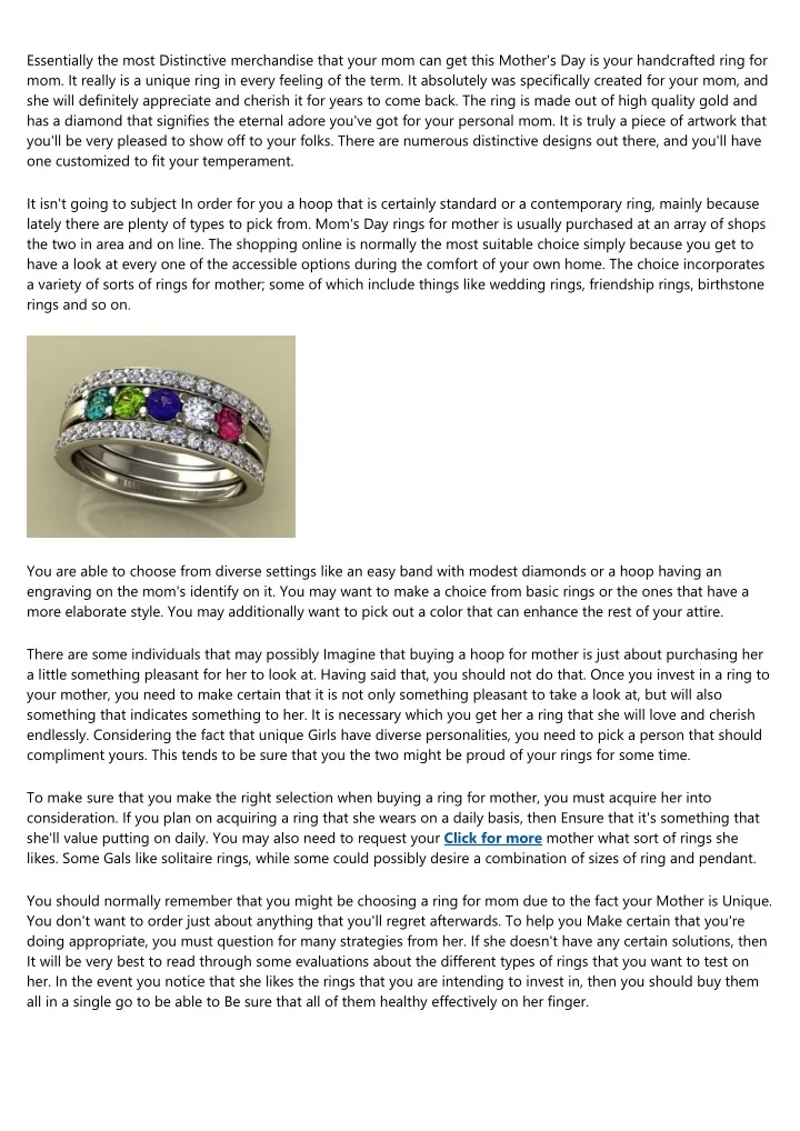 The most special item that the mom can get this Mom's Working day is your handcrafted ring for mom. It is a novel ring in just about every feeling from the term. It was specially suitable for your mother, and she or he will surely appreciate and cherish it For many years to come. The ring is made out of top of the range gold and has a diamond that signifies the eternal appreciate you may have for the mother. It is really a piece of art that you'll be happy to show off to your friends. There are various various models available, and you can have 1 custom made to suit your personality.<br><br>It does not matter In order for you a ring that is certainly conventional or a modern ring, mainly because lately there are several designs to pick from. Mother's Working day rings for mother may be acquired at an array of suppliers the two in regional and on the internet. The internet shopping is often the best option because you get to have a look at many of the accessible options from the consolation of your home. The selection incorporates a variety of types of rings for mom; several of which consist of marriage ceremony rings, friendship rings, birthstone rings and the like.<br><br>You can make a choice from different options like an easy band with modest diamonds or a hoop having an engraving with the mom's identify on it. You might want to choose from simple rings or people who have a more elaborate design and style. You might also want to pick a colour that can enhance the rest of your attire.<br><br>There are many people who may perhaps Consider that buying a hoop for mom is actually about shopping for her a thing good for her to have a look at. Even so, you should not try this. Once you acquire a ring for the mom, you'd like to make sure that It's not necessarily only a little something nice to have a look at, but additionally something that usually means some thing to her. It's important that you simply get her a hoop that she's going to love and cherish permanently. Considering that different Girls have unique personalities, you ought to pick just one that should compliment yours. This will likely be sure that you the two are going to be proud of your rings for many years.<br><br>To be sure that you make the right decision when buying a ring for mother, you need to consider her into consideration. If you intend on getting a ring that she wears on a regular basis, then Guantee that it truly is a thing that she'll appreciate wearing regularly. You might also need to talk to your mother what sort of rings she likes. Some Females like solitaire rings, while some may possibly choose a mix of sizes of ring and pendant.<br><br>You need to constantly do not forget that you are choosing a ring for mother simply because your Mother is Exclusive. You do not need to acquire anything that you'll regret later on. To aid Ensure that you are executing right, you ought to question for many tips from her. If she doesn't have any distinct suggestions, then It could be greatest to read some reviews about the differing types of rings you want to try on her. When you discover that she likes the rings that you will be planning to obtain, then you should purchase them all in one go to be able to Be sure that all of them healthy correctly on her finger.