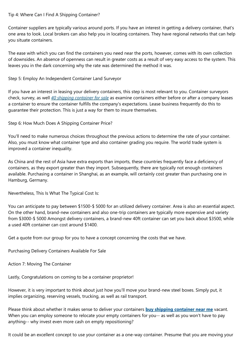 Tip 4: Where Can I Find A Shipping Container? Container suppliers are typically various around ports. If you have an interest in getting a delivery container, that's one area to look. Local brokers can also help you in locating containers. They have regional networks that can help you situate containers. The ease with which you can find the containers you need near the ports, however, comes with its own collection of downsides. An absence of openness can result in greater costs as a result of very easy access to the system. This leaves you in the dark concerning why the rate was determined the method it was. Step 5: Employ An Independent Container Land Surveyor If you have an interest in leasing your delivery containers, this step is most relevant to you. Container surveyors check, survey, as well 40 shipping container for sale as examine containers either before or after a company leases a container to ensure the container fulfills the company's expectations. Lease business frequently do this to guarantee their protection. This is just a way for them to insure themselves. Step 6: How Much Does A Shipping Container Price? You'll need to make numerous choices throughout the previous actions to determine the rate of your container. Also, you must know what container type and also container grading you require. The world trade system is improved a container inequality. As China and the rest of Asia have extra exports than imports, these countries frequently face a deficiency of containers, as they export greater than they import. Subsequently, there are typically not enough containers available. Purchasing a container in Shanghai, as an example, will certainly cost greater than purchasing one in Hamburg, Germany. Nevertheless, This Is What The Typical Cost Is: You can anticipate to pay between $1500-$ 5000 for an utilized delivery container. Area is also an essential aspect. On the other hand, brand-new containers and also one-trip containers are typically more expensive and variety from $3000-$ 5000 Amongst delivery containers, a brand-new 40ft container can set you back about $3500, while a used 40ft container can cost around $1400. Get a quote from our group for you to have a concept concerning the costs that we have. Purchasing Delivery Containers Available For Sale Action 7: Moving The Container Lastly, Congratulations on coming to be a container proprietor! However, it is very important to think about just how you'll move your brand-new steel boxes. Simply put, it implies organizing, reserving vessels, trucking, as well as rail transport. Please think about whether it makes sense to deliver your containers buy shipping container near me vacant. When you can employ someone to relocate your empty containers for you-- as well as you won't have to pay anything-- why invest even more cash on empty repositioning? It could be an excellent concept to use your container as a one-way container. Presume that you are moving your