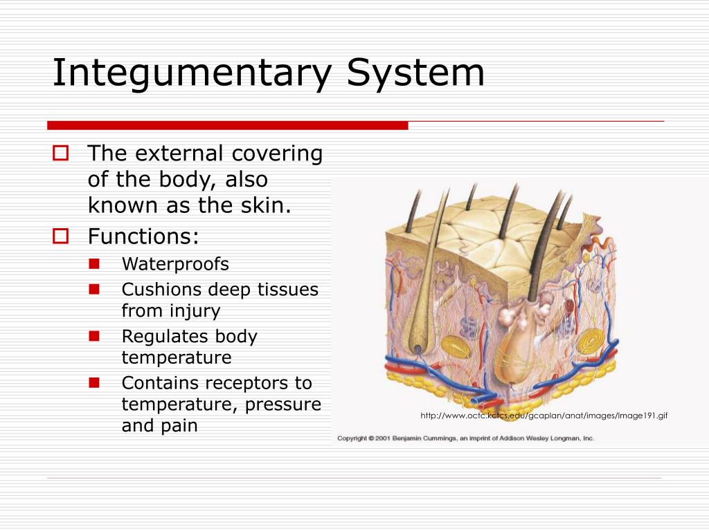 The external covering of the body, also known as the skin. Functions: Waterproofs Cushions deep tissues from injury Regulates body temperature Contains receptors to temperature, pressure and pain Integumentary System http://www.octc.kctcs.edu/gcaplan/anat/images/Image191.gif