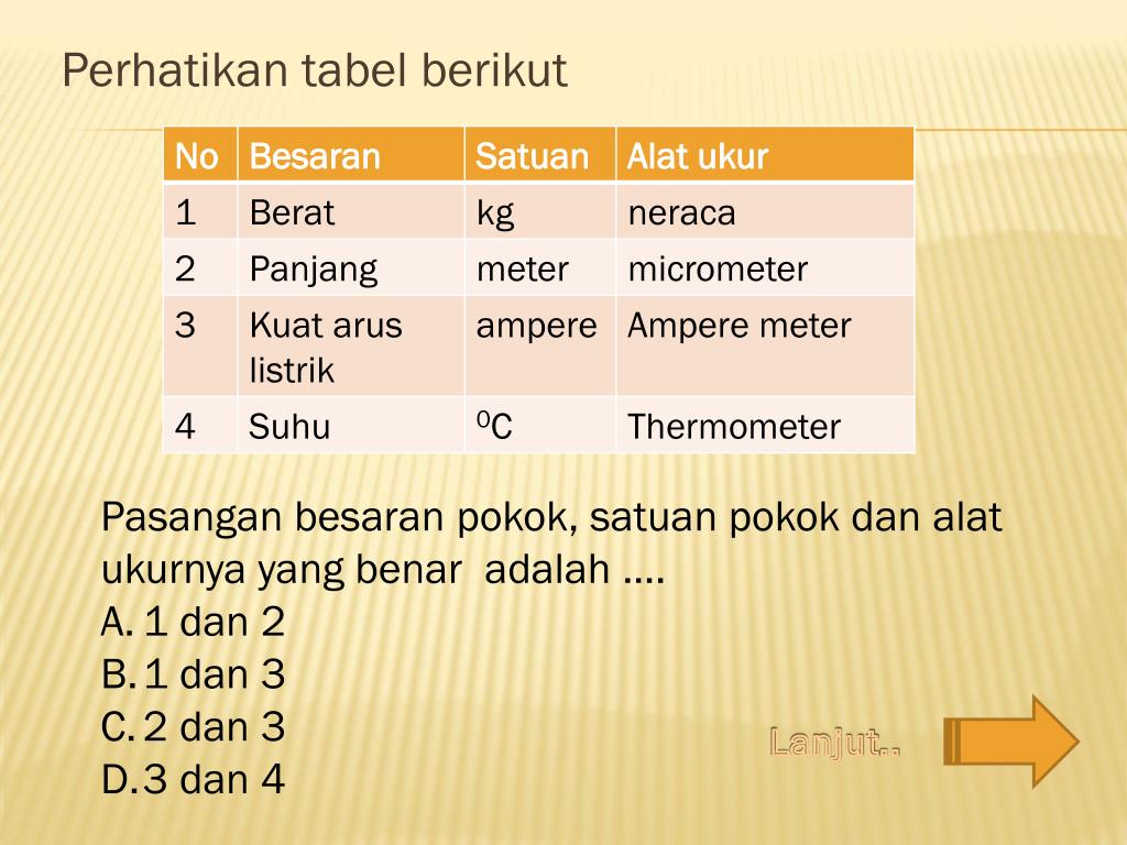 Perhatikantabelberikut ! • Besaranpokok , satuan SI danalatukur yang sesuaipadatabeldiatasadalah …. • 1 dan 4 • 2 dan 3 • 1 dan 3 • 2 dan 4 Lanjut..