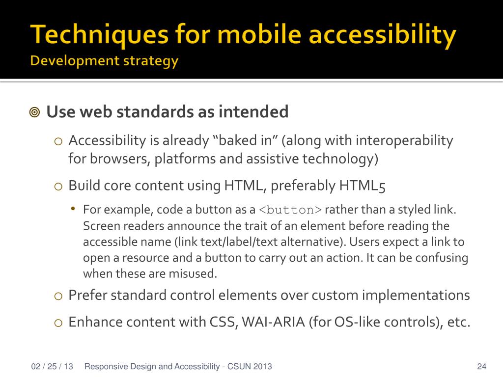 Techniques for mobile accessibilityDevelopment strategy • Use web standards as intended • Accessibility is already “baked in” (along with interoperability for browsers, platforms and assistive technology) • Build core content using HTML, preferably HTML5 • For example, code a button as a <button> rather than a styled link. Screen readers announce the trait of an element before reading the accessible name (link text/label/text alternative). Users expect a link to open a resource and a button to carry out an action. It can be confusing when these are misused. • Prefer standard control elements over custom implementations • Enhance content with CSS, WAI-ARIA (for OS-like controls), etc. Responsive Design and Accessibility - CSUN 2013