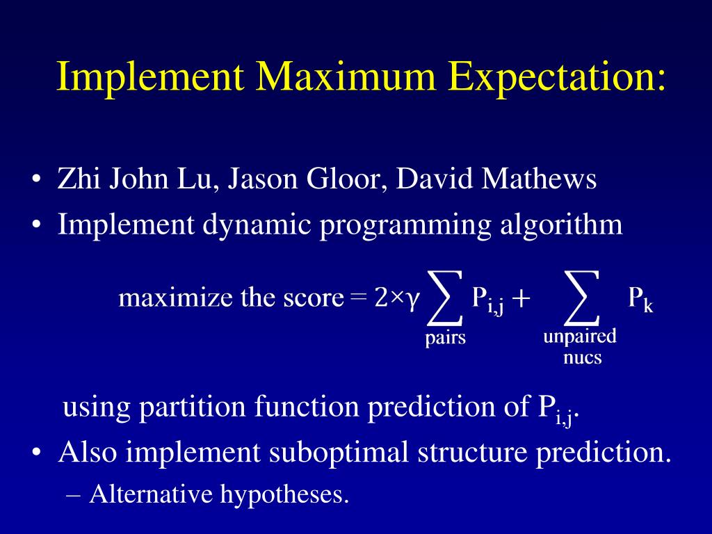 Implement Maximum Expectation: • Zhi John Lu, Jason Gloor, David Mathews • Implement dynamic programming algorithm using partition function prediction of Pi,j. • Also implement suboptimal structure prediction. • Alternative hypotheses.