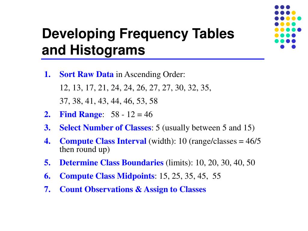 Developing Frequency Tables and Histograms • Sort Raw Data in Ascending Order: • 12, 13, 17, 21, 24, 24, 26, 27, 27, 30, 32, 35, • 37, 38, 41, 43, 44, 46, 53, 58 • Find Range: 58 - 12 = 46 • Select Number of Classes: 5 (usually between 5 and 15) • Compute Class Interval (width): 10 (range/classes = 46/5 then round up) • Determine Class Boundaries (limits): 10, 20, 30, 40, 50 • Compute Class Midpoints: 15, 25, 35, 45, 55 • Count Observations & Assign to Classes